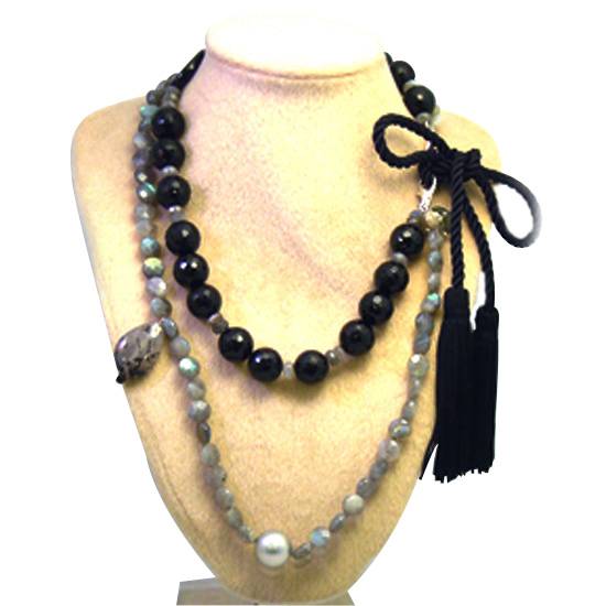 This is a necklace with 28 inches. It is designed with ribbon tassles, pearl and labradorite. An ideal accessory for ladies.