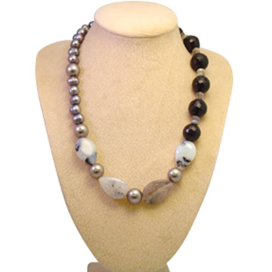 This is a necklace with differnt type of jewellery. It is designed with labradorite, mother of pearl and fresh water pearl. An ideal accessory for ladies.