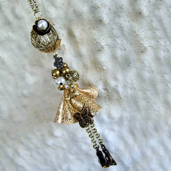 This fashionable doll necklace is made of plastic beads, brass beads and metal chains. This metalic designed necklace features a white bead inlaid in a golden ball and some small beads in the middle. There are also a heart-shaped bead, a butterfly bead and two plastic drops in its end.