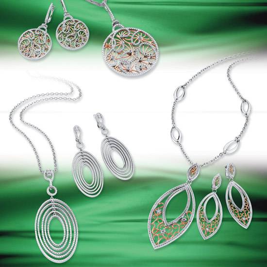 This includes a total of three sets of necklaces and earrings of different designs. One of the types features five concentric circles embroidered with beads. The other two sets have similar irregular and orange patterns, but one is in round shape, while the other one is in leaf-shape. They are all open work designs.