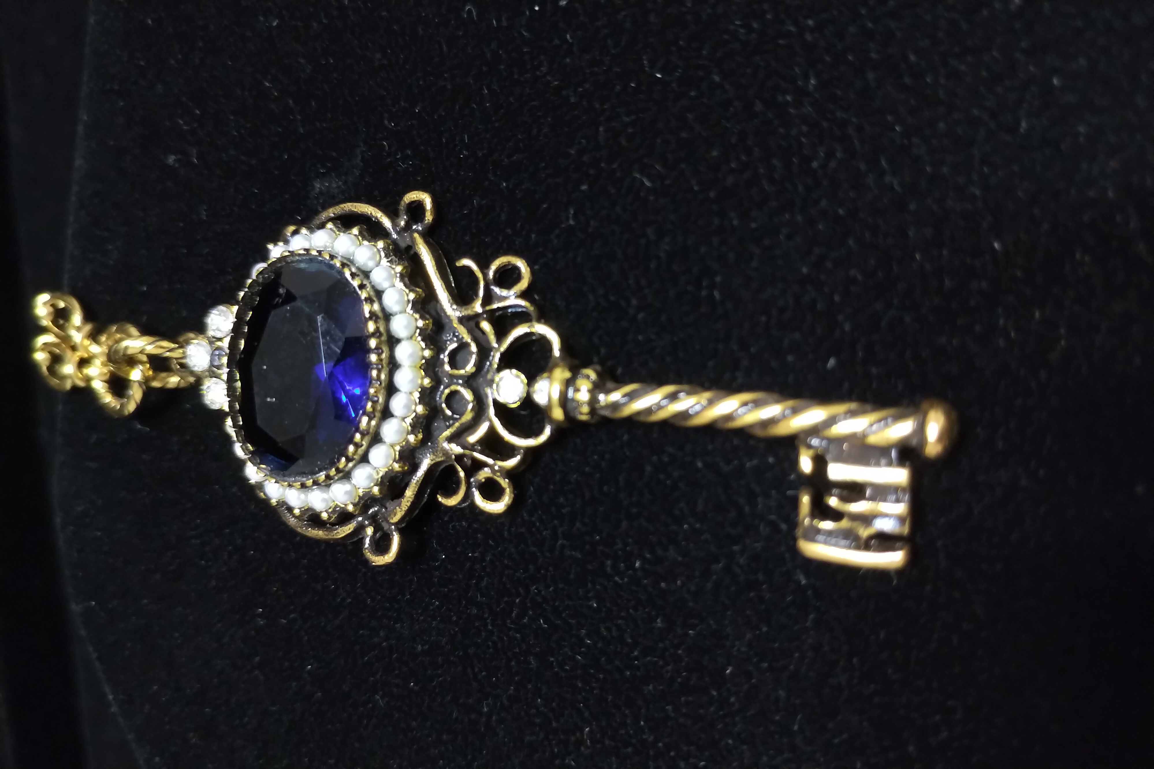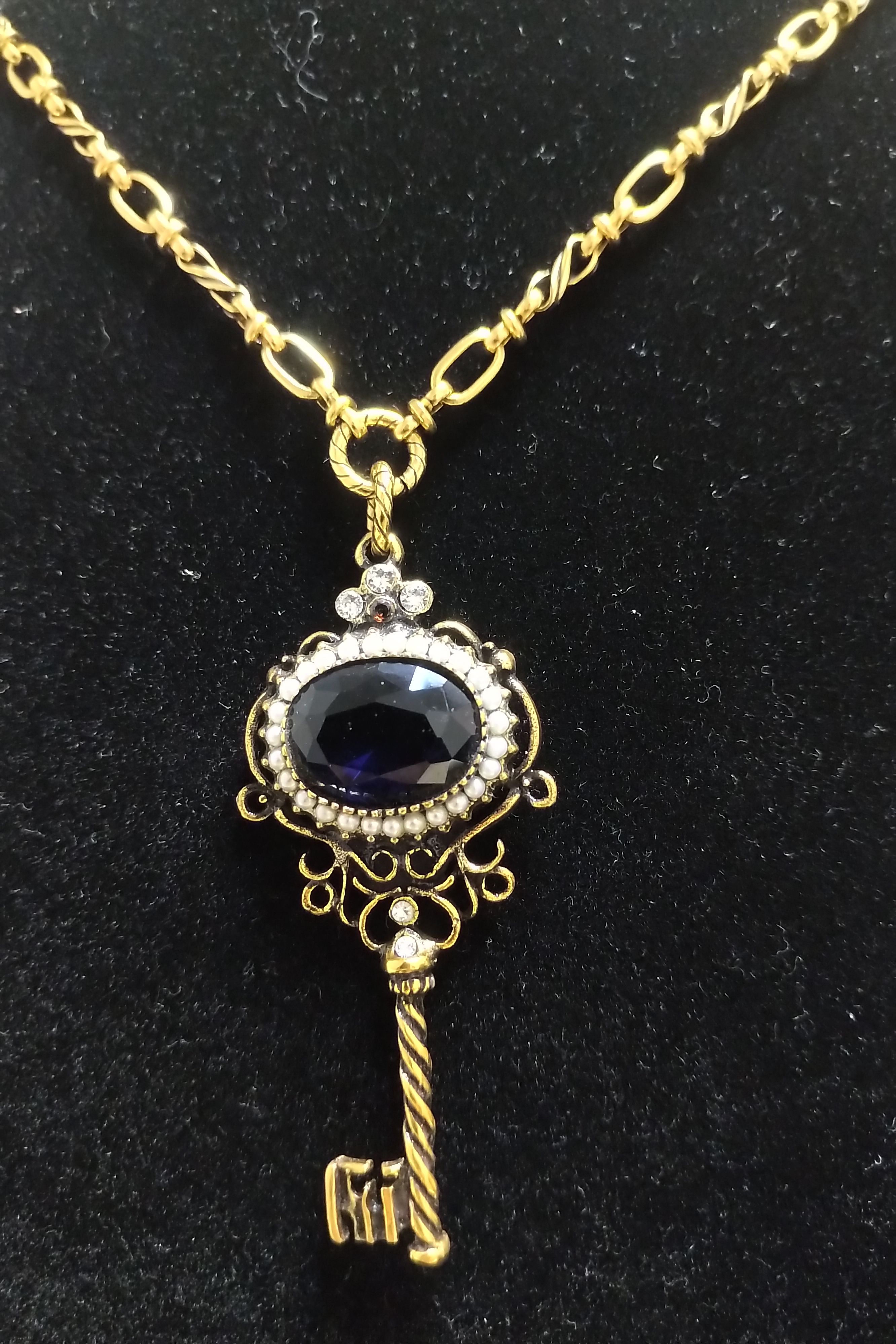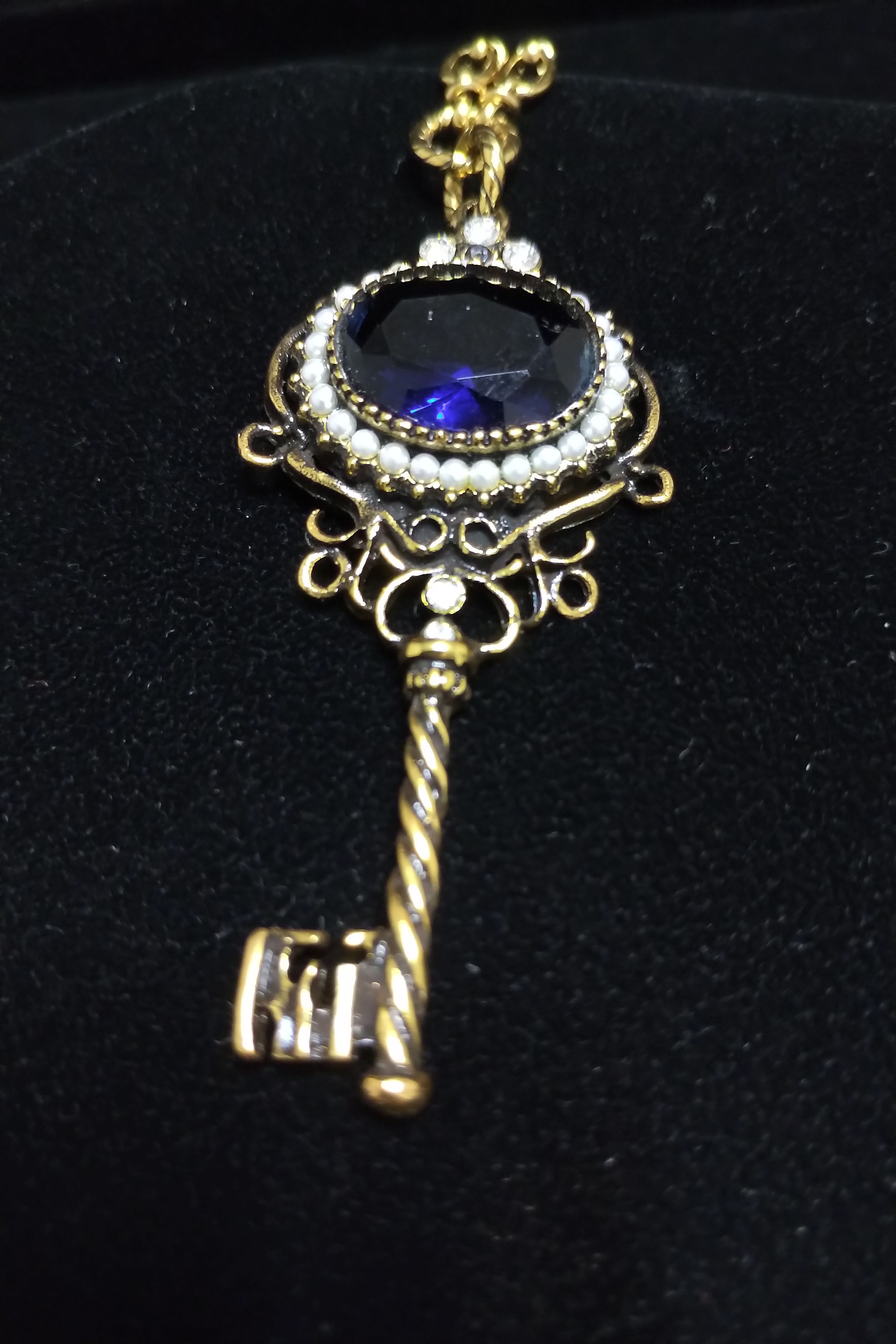 • Necklace in golden brass and key with small blue crystal, micro-pearls