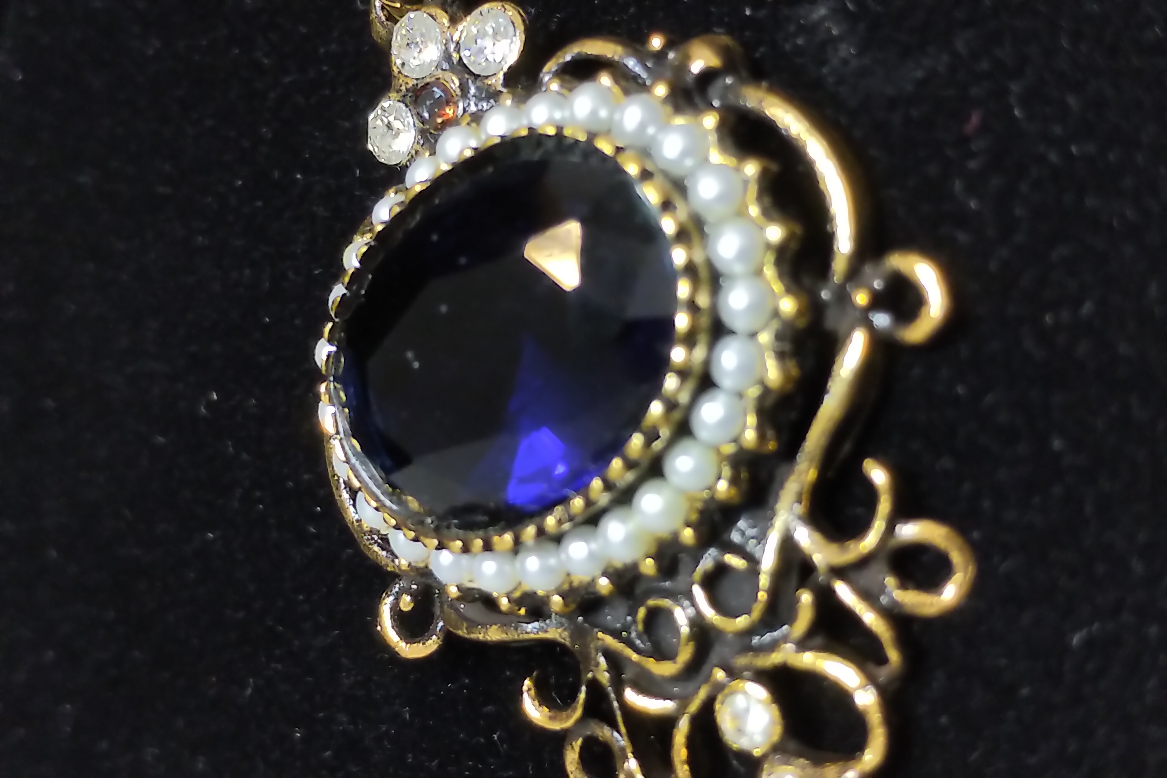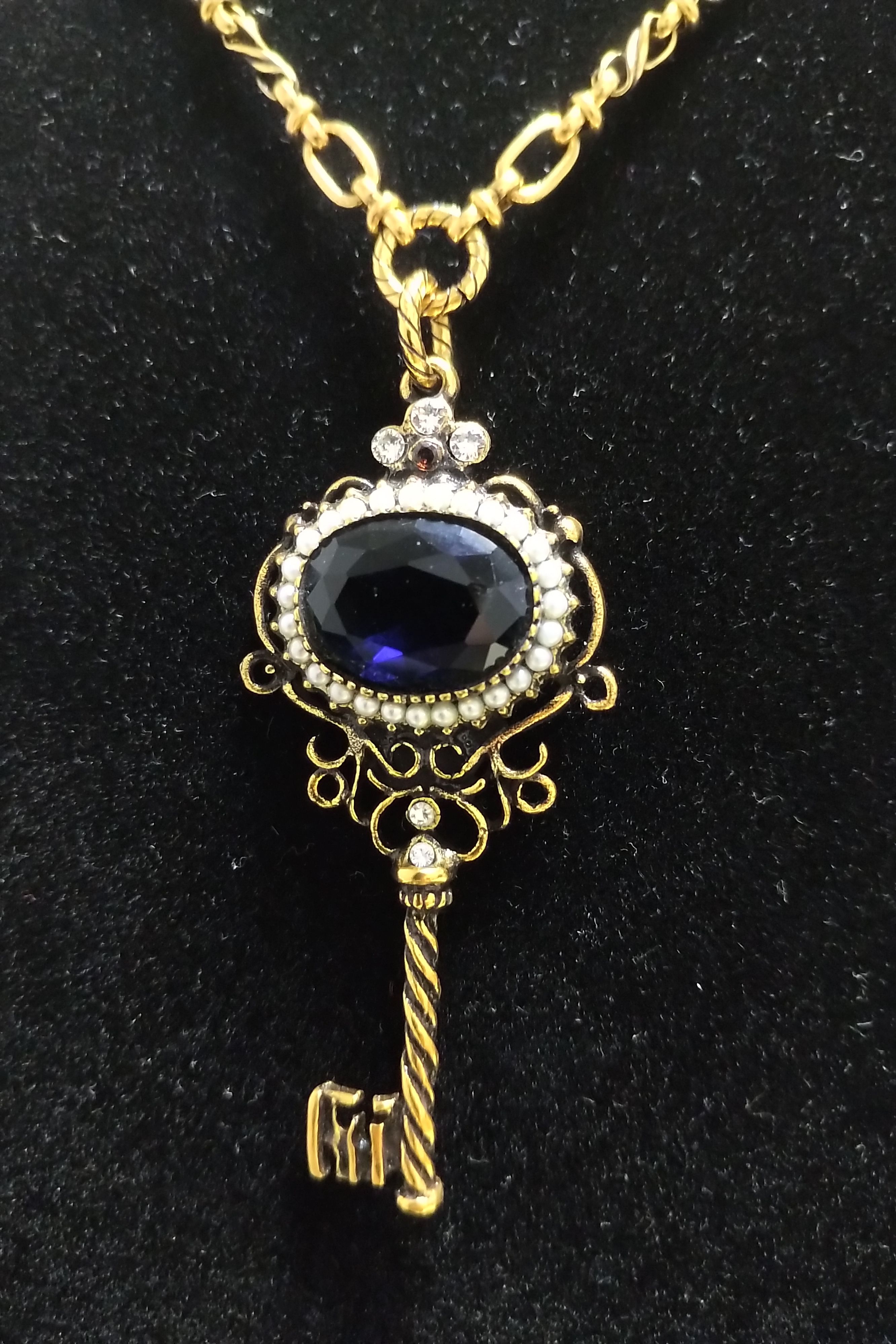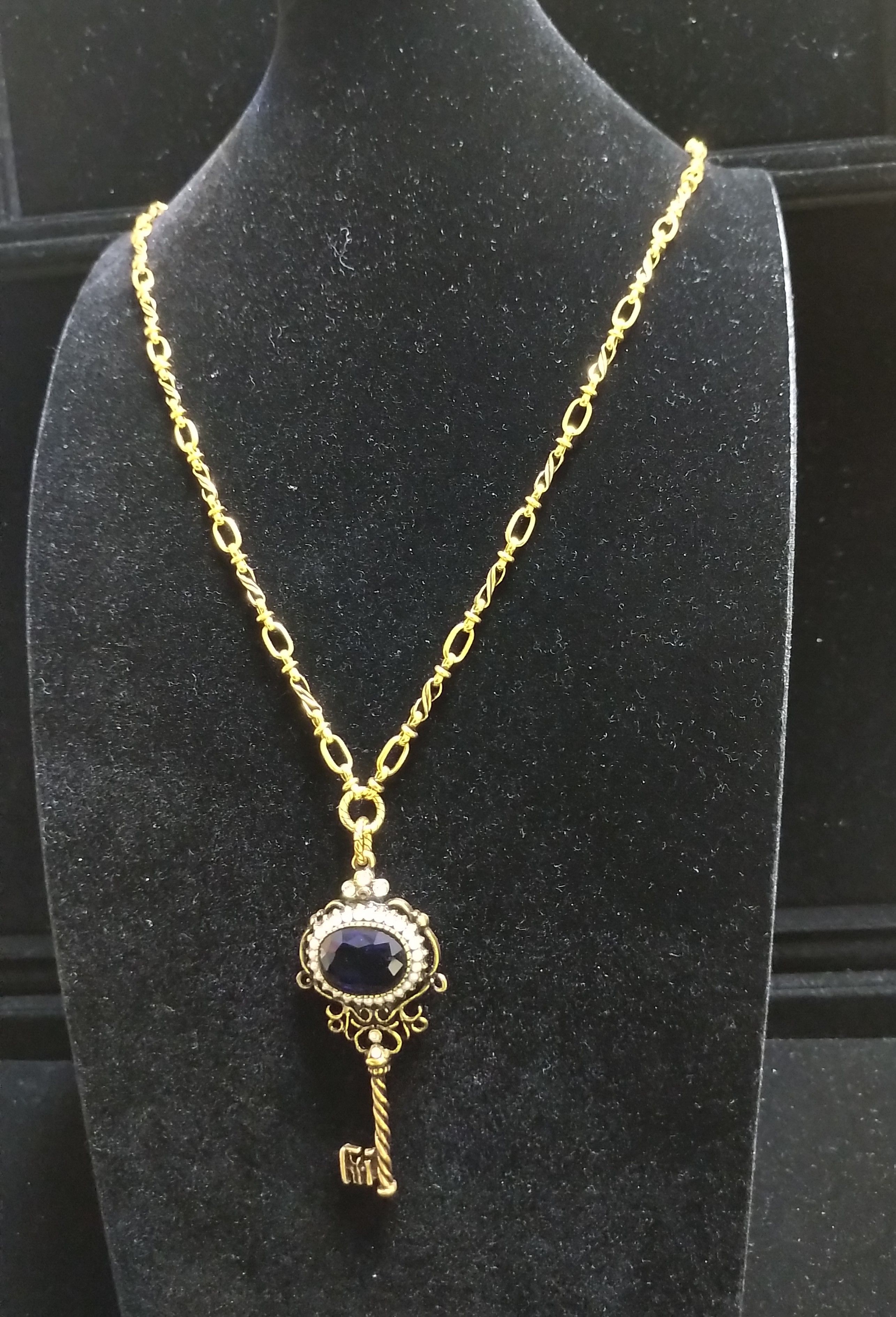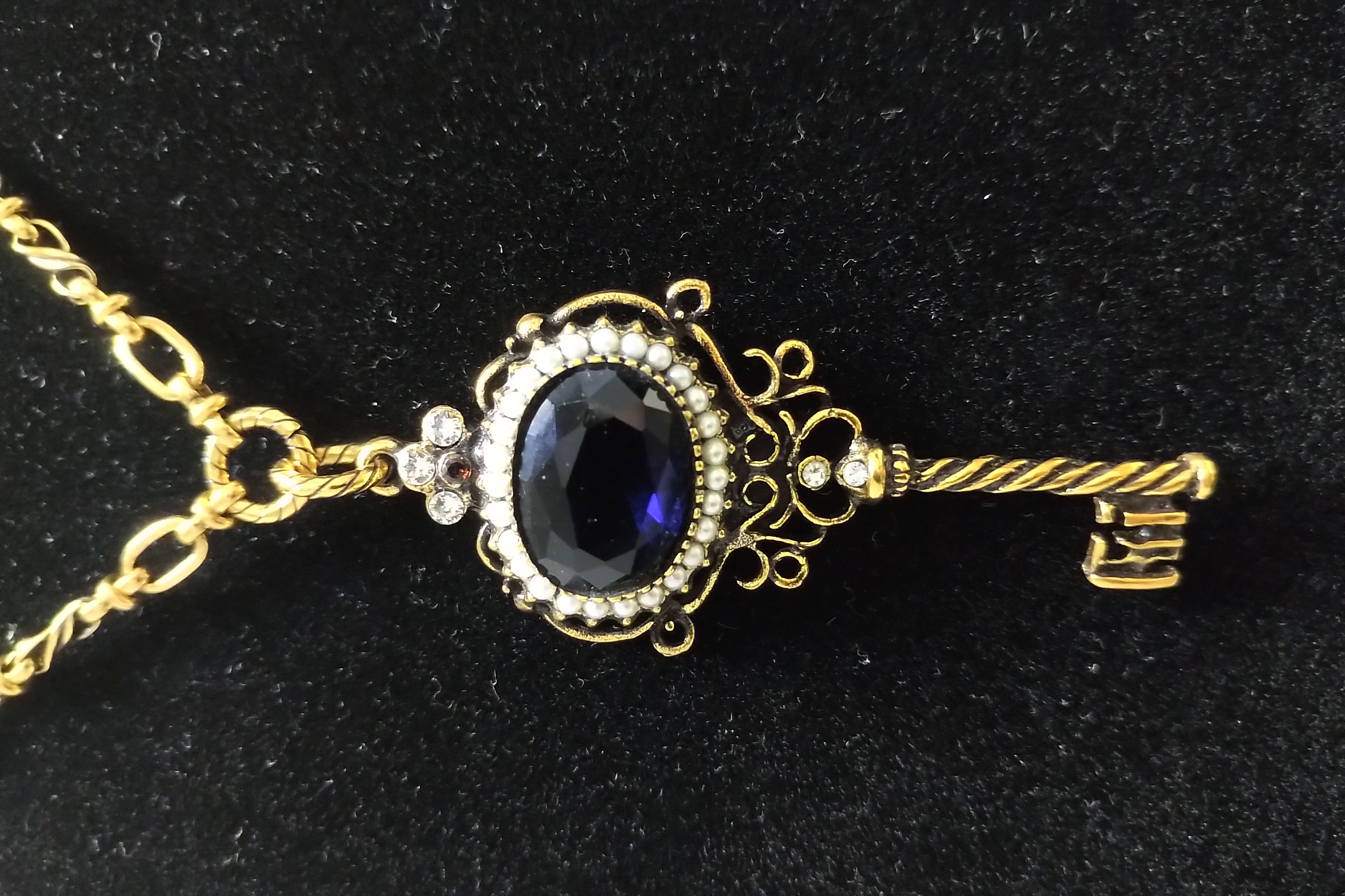 • Necklace in golden brass and key with small blue crystal, micro-pearls