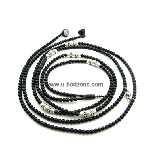 This is an earphone with a unique and fashionable design. It is strung of black beads for a touch of style. The stylish in-ear earphone allows you to enjoy your favorite songs anywhere.