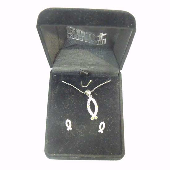 Featured here is a beautiful set of necklace and earrings for ladies. The pendant and earrings are designed in a fish shape, formed by simple lines. Shiny stones are set all over the silver surface as embellishments.