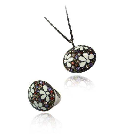 This eye-catching flower jewelry set includes a necklace and a ring. Each piece of the jewelry features a button-shaped design accented by white flowers and twinkling colorful stones. It makes an ideal gift choice for young ladies.