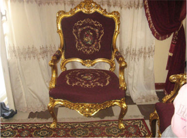 Gain a sense of superiority by sitting on this palace chair. The golden frame is delicately crafted with an alluring silhouette while both of the straightened back panel and the comfy seat are adorned with fascinating needlepoints. These artistic reflective patterns create a beautiful scenery in which a shadow sleeps deeply on a serene lake. Long lasting service can be promised by the textured arms and the sturdy standing legs.