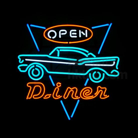This is a neon sign featuring a triangle pattern, a car pattern and words "Diner Open". It boasts a colorful design for an eye-catching purpose. This artistic and distinctive sign is an ideal choice for your restaurant.
