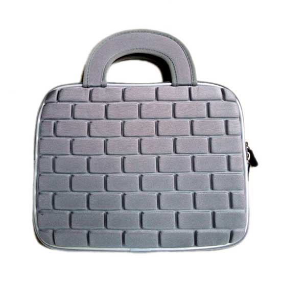 This laptop case in gray features wall-like patterns and flat handles for a characteristic look. It is made of neoprene for softness and sturdiness. This fashionable laptop case is finished with a zipper closure.