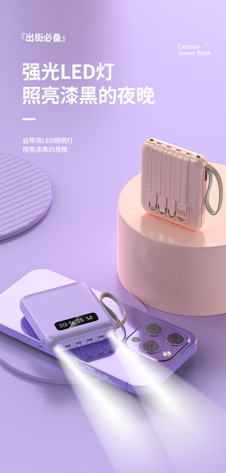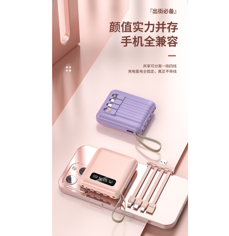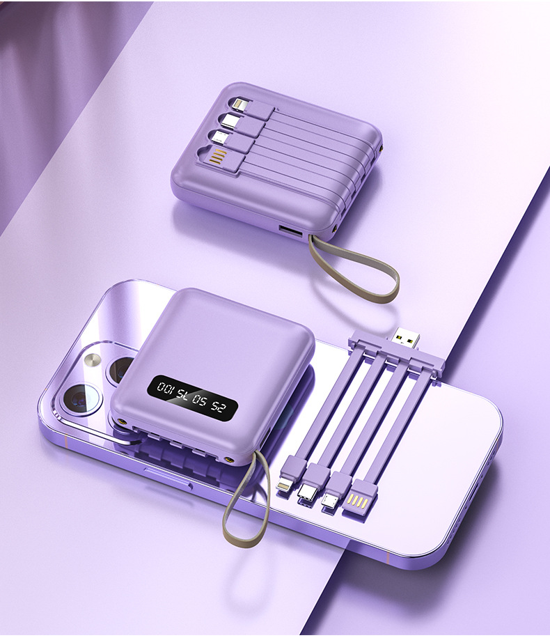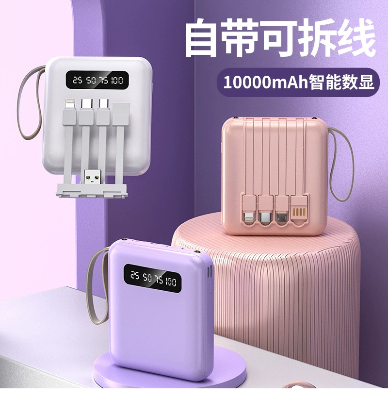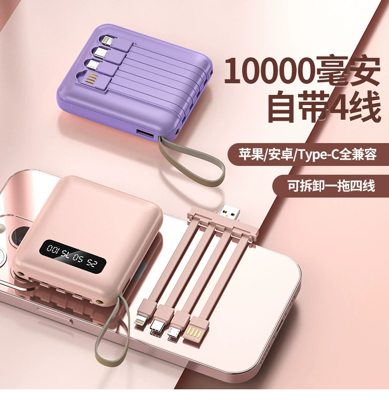 New 4 in 1 portable power bank charging treasure with its own line 10000mAh digital display mobile power supply mini power bank with lanyard customized LOGO