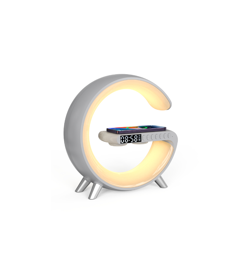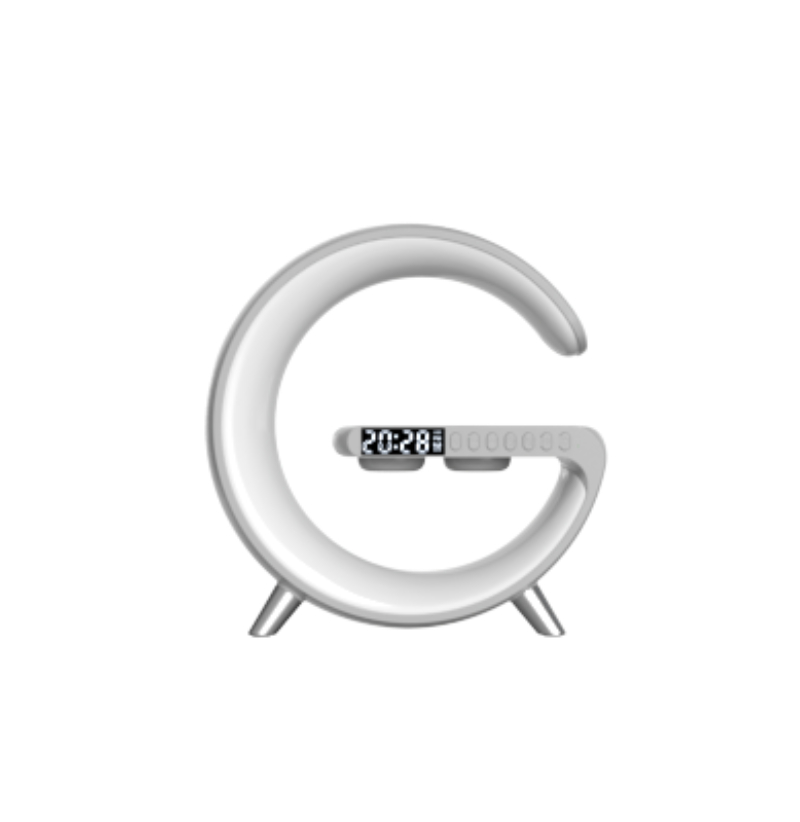 New 7 in 1 health & intelligent life assistant G shape clock speaker wake up light + dimmable + Natueral sleep Aid+ 256 kinds lighting modes + Alarm clock+ 15W wireless charger + Bluetooth speaker + App/ button control