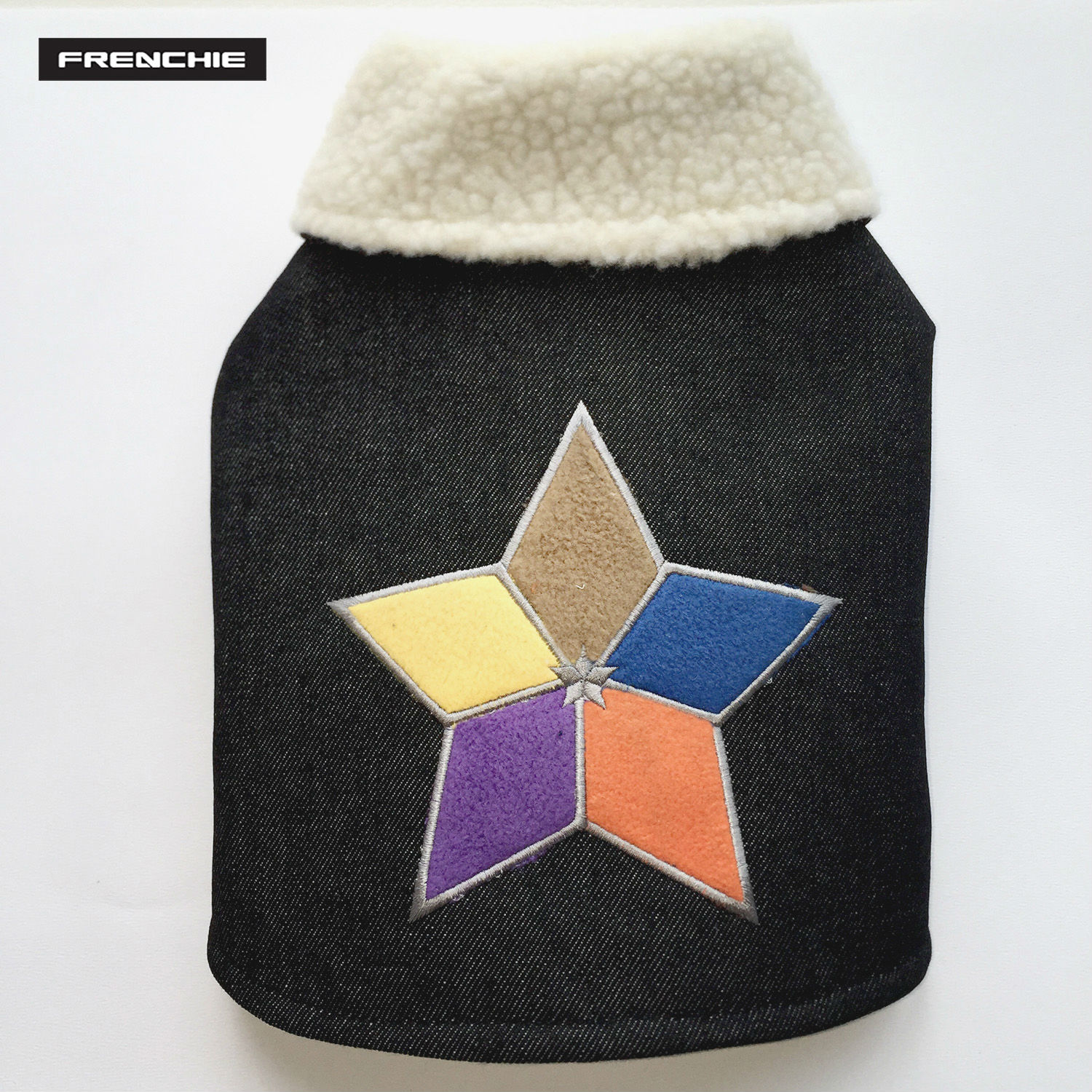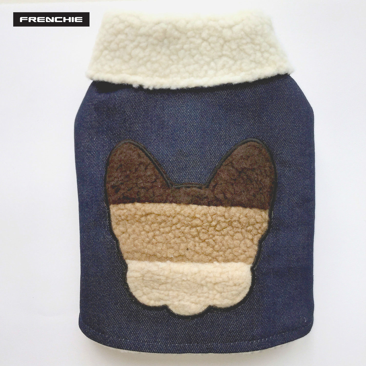 High quality 100% cotton denim dog coat, made with authenticity. The collar is designed to be worn flipped back so that the super soft cream sherpa lining is revealed. Soft and cosy for Autumn and Winter. Adjustable at neck and belly, the Brunaille dog coat can accommodate a tshirt, hoodie, and is a surefire way to get noticed at dog park and social gatherings.