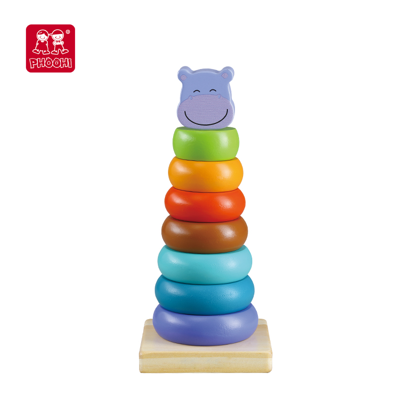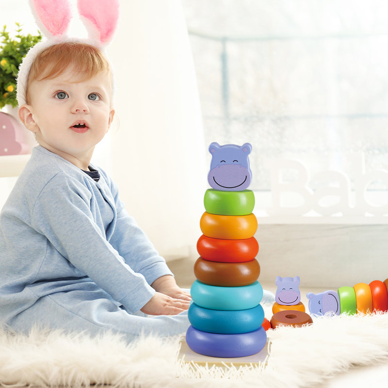 Smooth, easy-to-grasp wooden pieces to stack on a solid-wood rocking base.