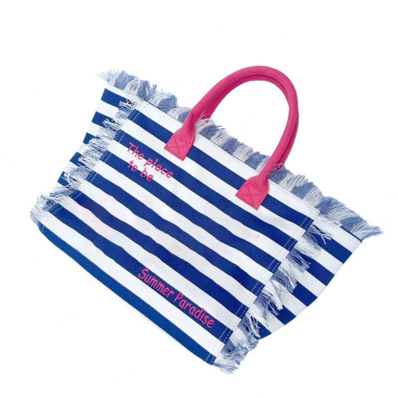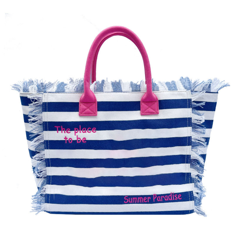 New European and American style large-capacity fashionable wide-strip patterned deep blue fringed beach handbag for women
