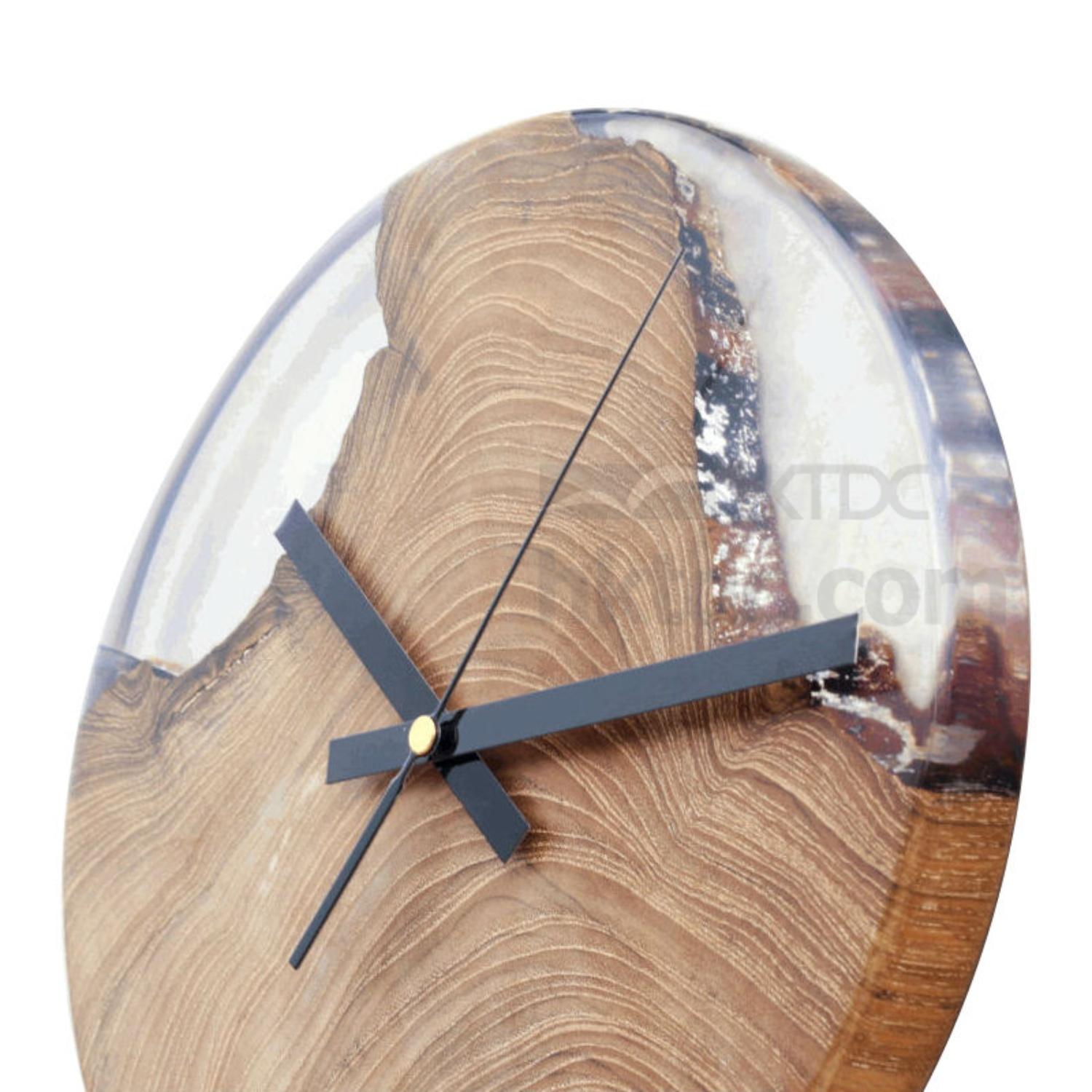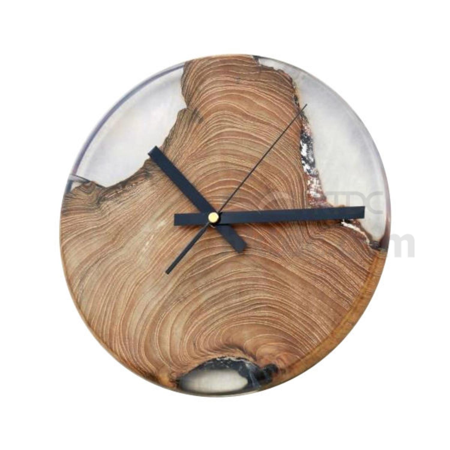 Displayed here is a wall clock made of wood and epoxy resin. It is round shaped and has three hands for telling time. This wall clock comes in a minimalistic design and is equipped with mechanics from Seiko Japan to ensure precision.