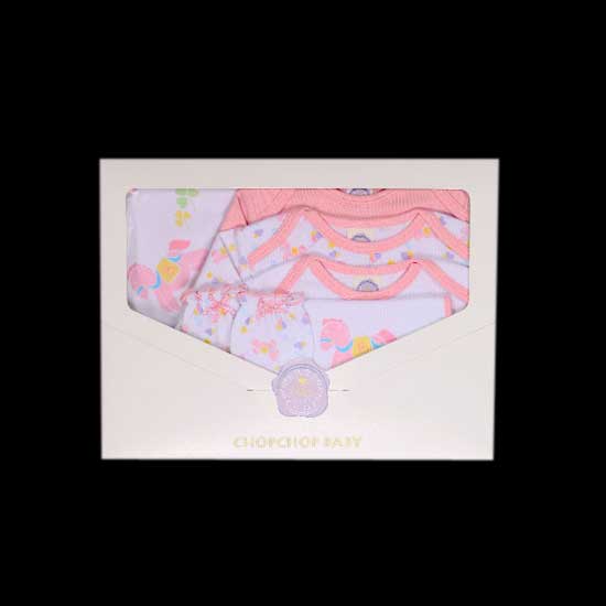 Displayed is a newborn clothing gift set. Made of knitted cotton, this gift set include a body suit and socks that are comfortable and soft. This high quality baby clothing gift set is a practical gift for newborns.