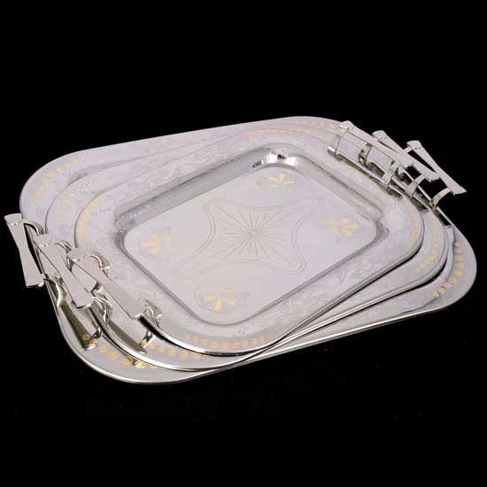 Presented here is a set of trays treated with nickel plating for enhanced durability. The nickel plated trays come with an elegant design with genuine gold patterns. The trays are recommended for high-end eateries, hotels or serviced apartments.