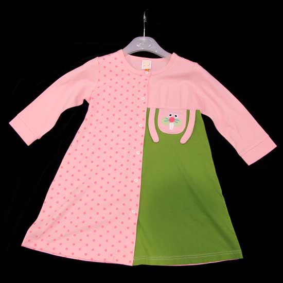 Featured is a long-sleeve night dress for girls. The design looks adorable with a rabbit decoration. The pink and green colors form a refreshing match to appeal to girls.