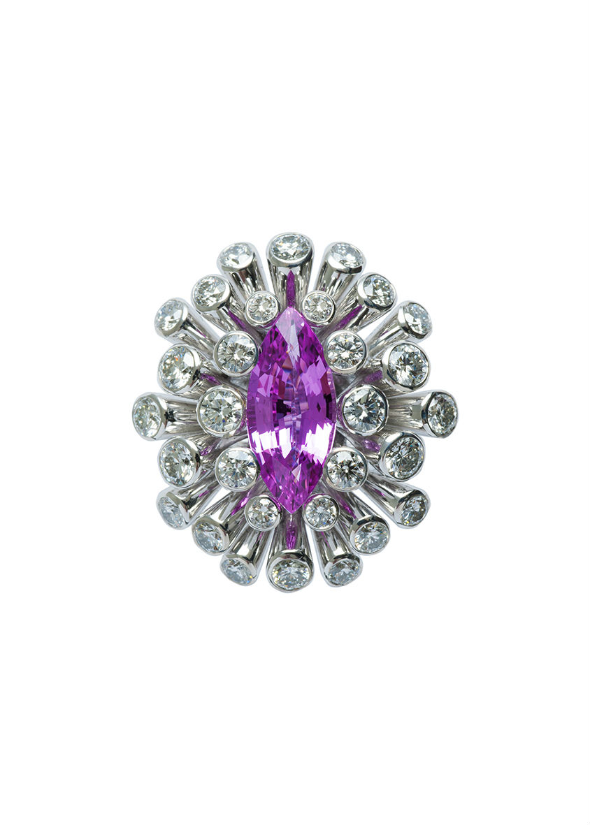 This magnificent 2.330 carat No heat Pink Sapphire marquise cut is set and embraced by a scintillating of top quality round diamond D-color, heart and Arrows in a 18 carat White Gold pipe in a Sea Anemone-shaped design.