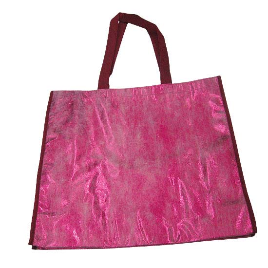 This non-woven shopping bag features pink metallic lamination for a distinguished appearance. The bag boasts high structural strength for long-lasting use. The handles are robustly stitched to ensure improved carrying reliability.