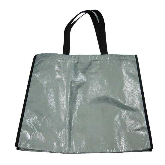Displayed is a shopping bag made of high-quality non-woven material. The dual-color bag comes with exquisite metallic lamination for a unique appearance. The sturdy construction guarantees long-term servicing.