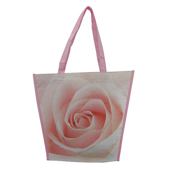 This non-woven shopping bag is printed with a big rose in graceful pink. The inverted trapezium shape displays a unique style. The long handles are made of strong material to ensure high reliability.