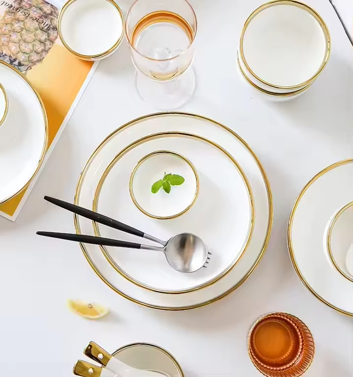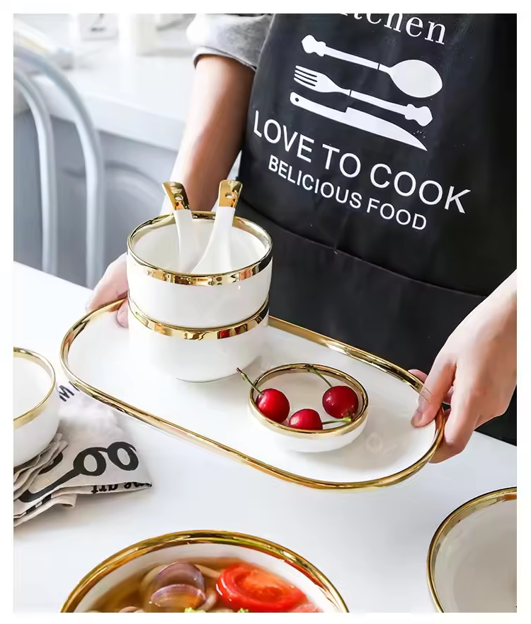Nordic Light Luxury Classic Gold-Rimmed Ceramic Dinnerware Set for 2-8 Persons Reusable Customized Color Household Tableware