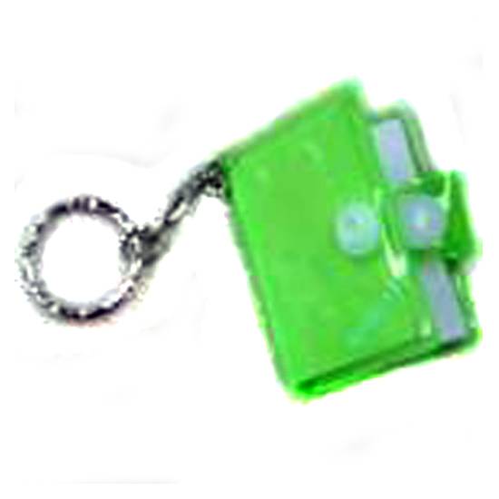 This is a key chain with a shiny plastic cover in green color. It has blank white paper inside for writing and drawing. There is a white button in the front for closure.