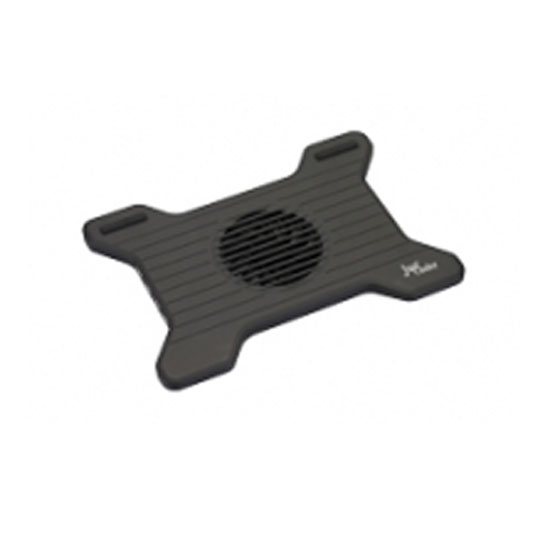 Featured is a notebook cooling pad with a built-in fan that effectively pulls heat away from the bottom of the notebook computer. The pad can be powered by the USB cable provided. It helps vent the heat through the back.