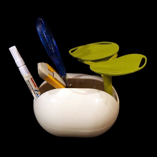 This featured pen holder adopts the shape of a sprouting bean. Users can easily store pens and other stationery in the opened bean container. The two emerging leaves provide extra storage space on your desk.