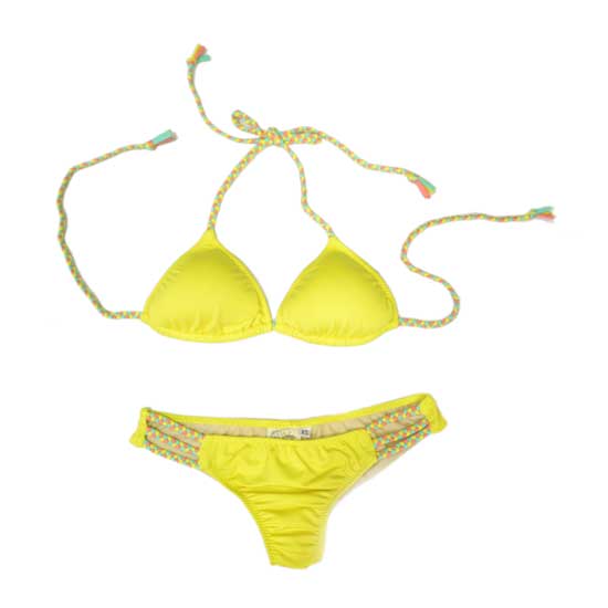 This lovely ladies' bikini features a vibrant braided design with an allover yellow hue. It offers a soft and comfortable fit to wearers. A nylon lining and a minimal coverage design highlight this extraordinary swimsuit.