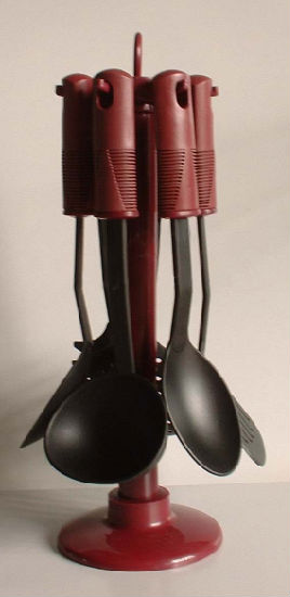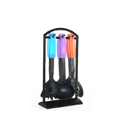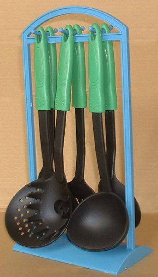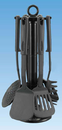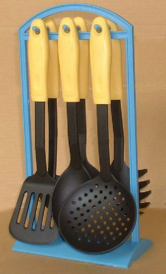 Here are everything you need for being a top chef. The nylon cookware set includes a turner, a slotted turner, a ladle, a spoon, a slotted spoon and a spaghetti server. All are hanged on a cylindrical rack, which keeps the storing space to a minimum.