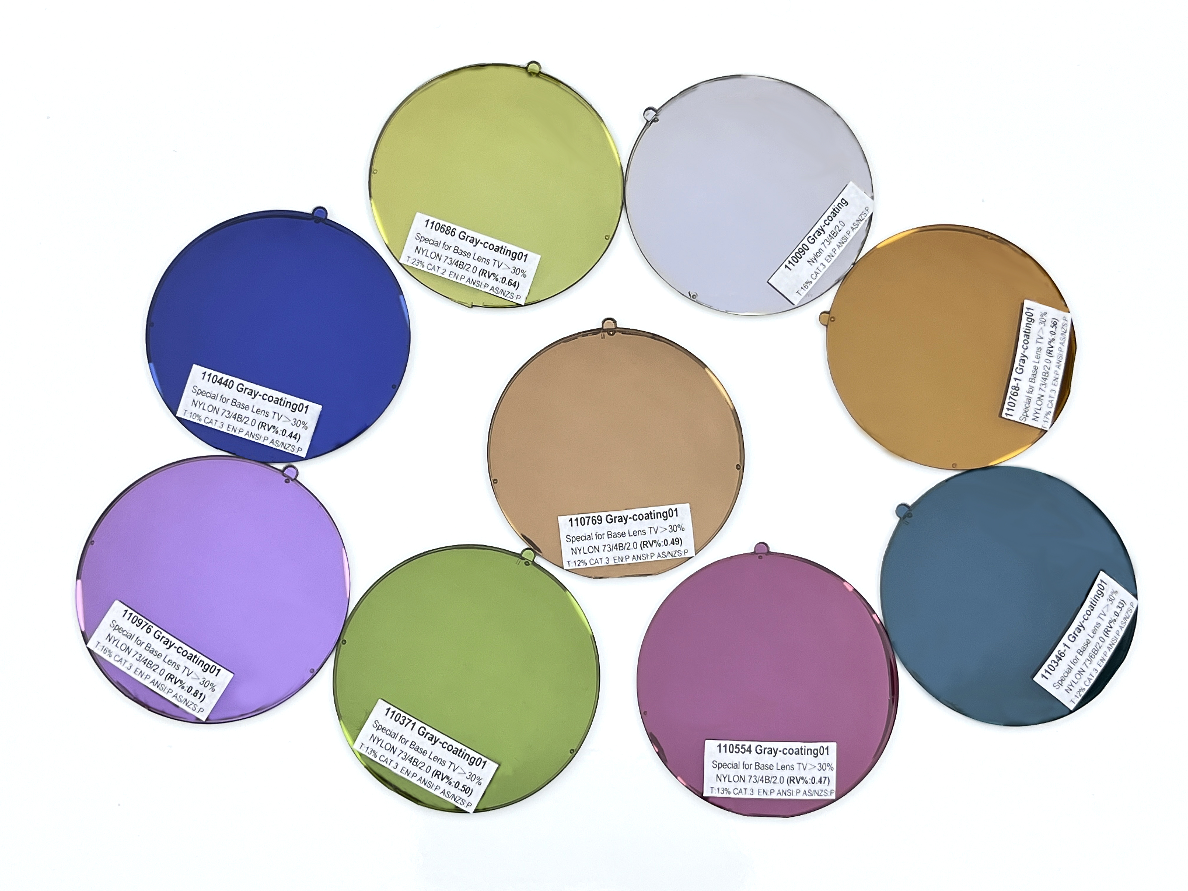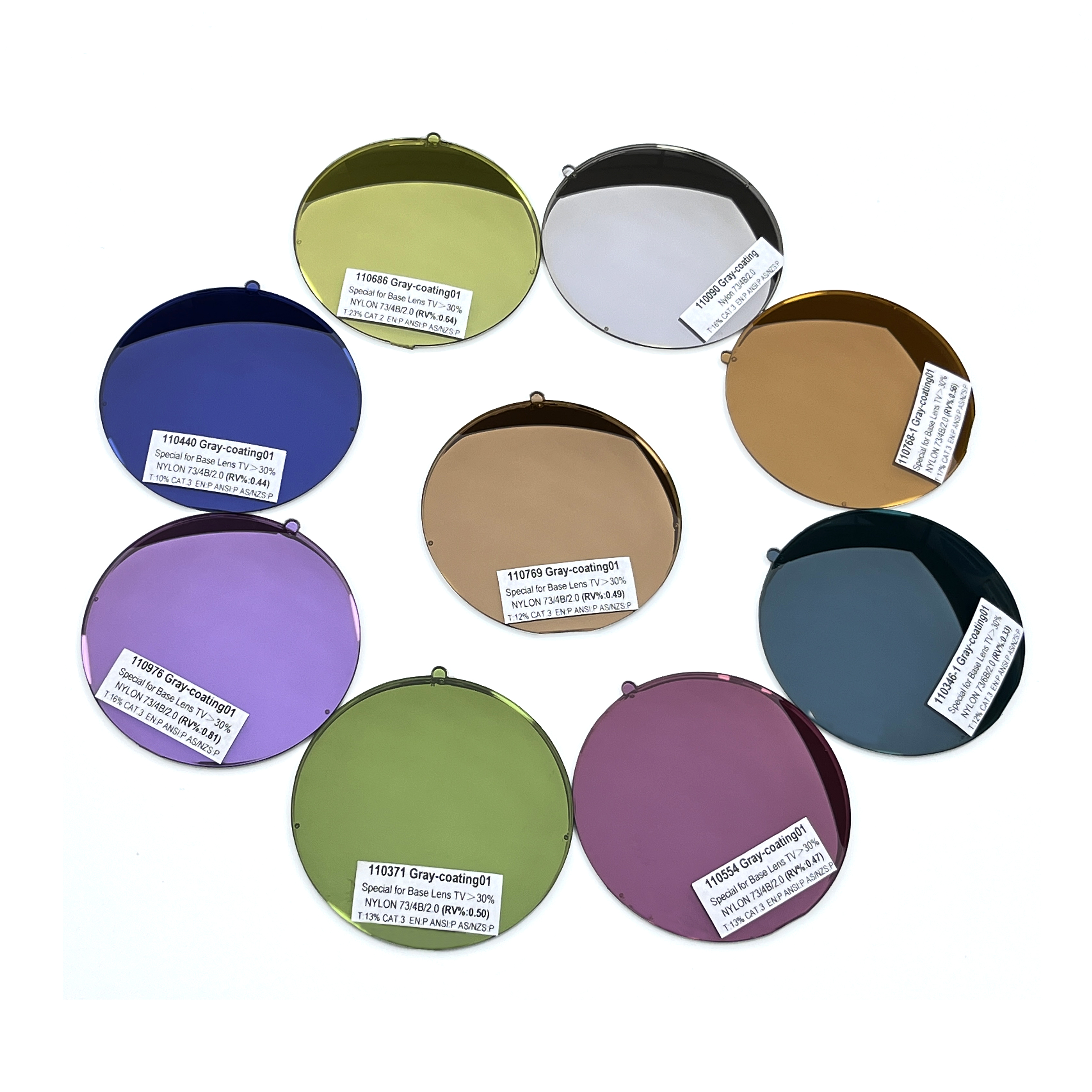 Nylon sunglasses with a stylish round shape offer lenses in a spectrum of colors: pink, purple, orange, blue, green, and grey. These versatile shades provide excellent eye protection, making them a fashionable choice for any sunny day.