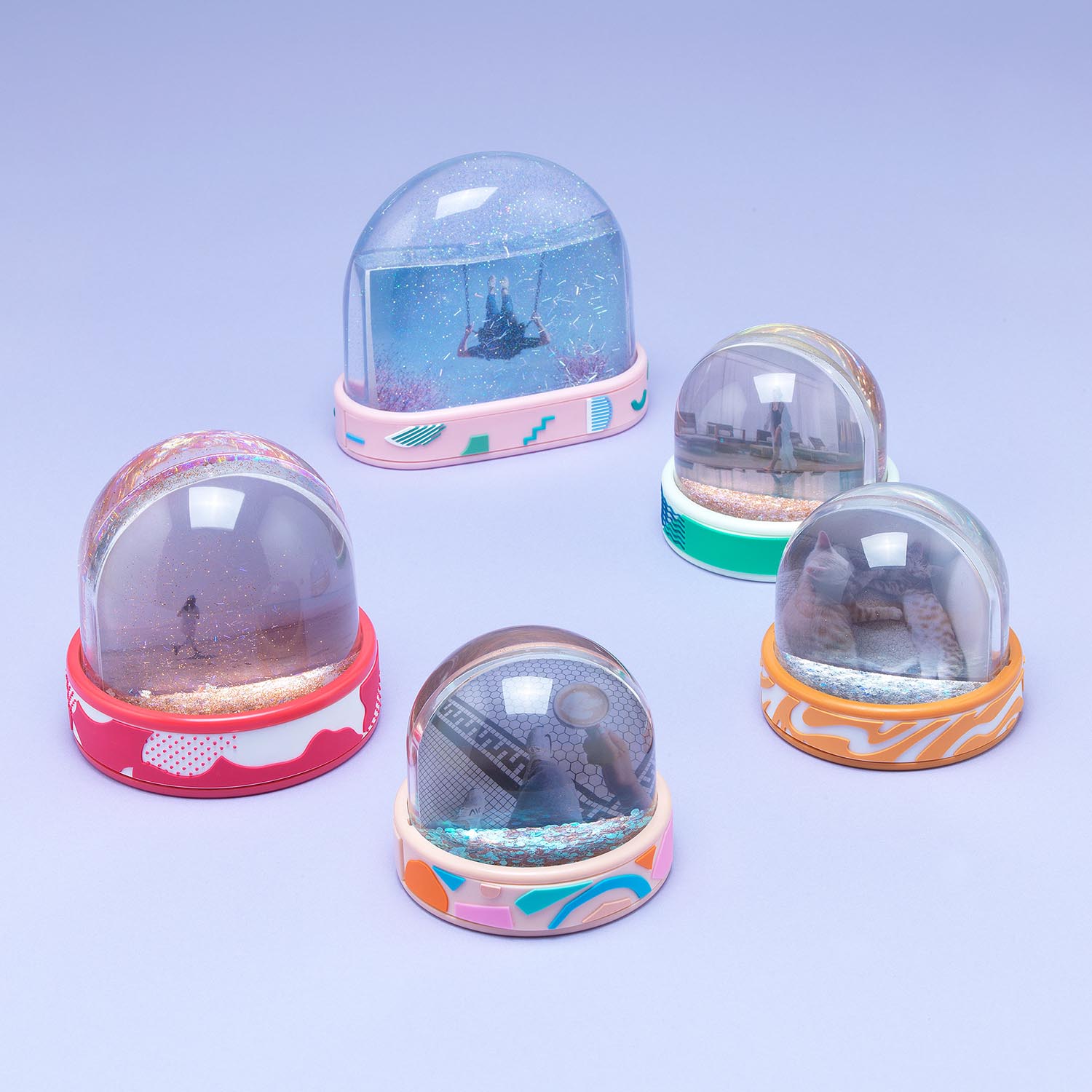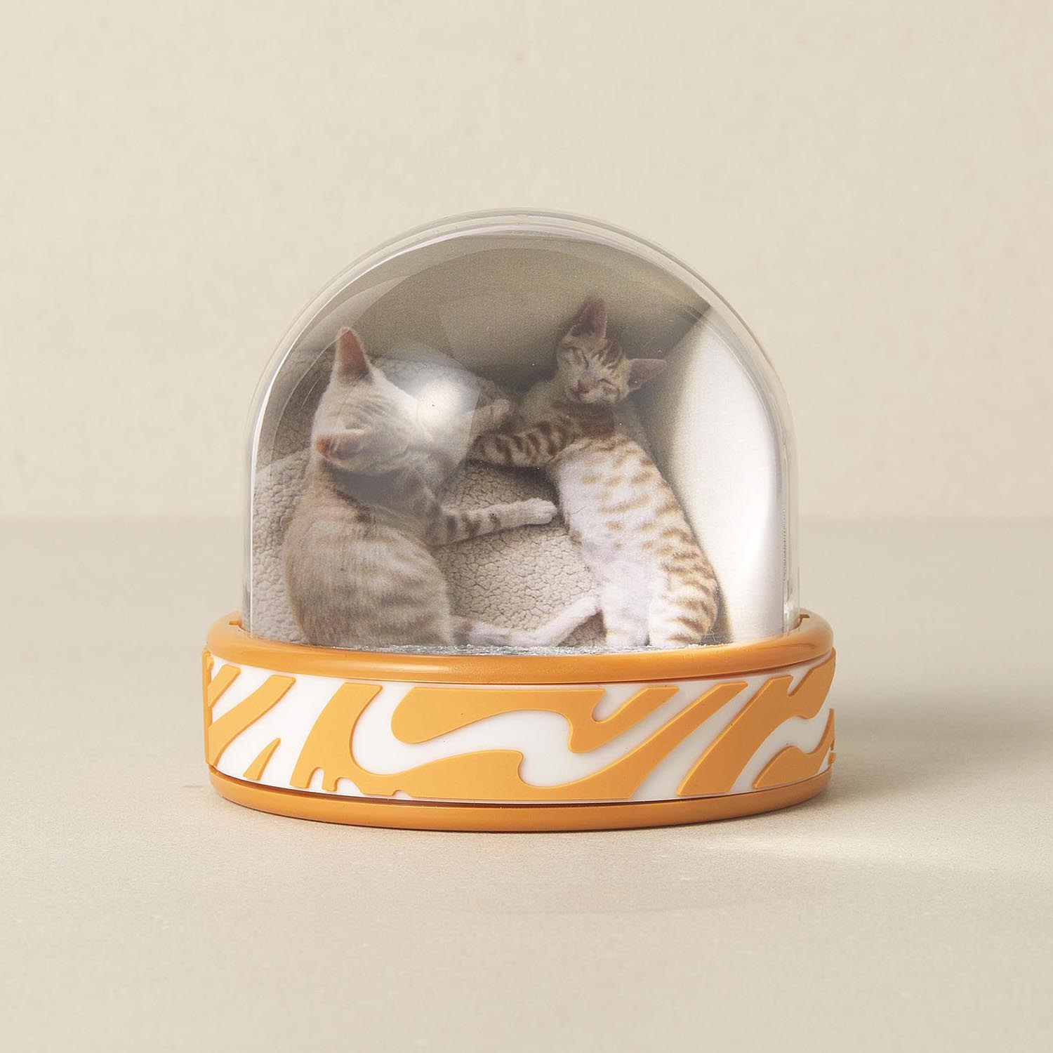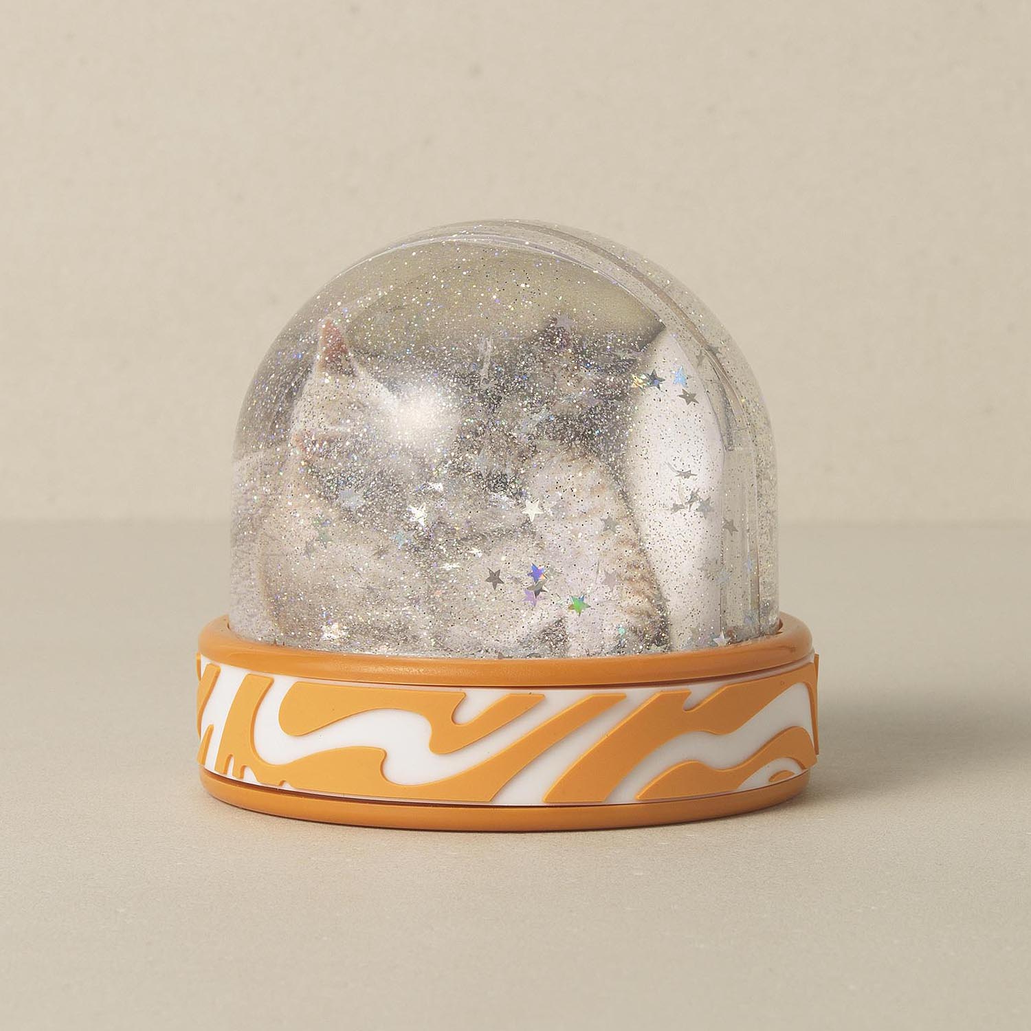 Small photo water globe with customizable base design that is perfect for displaying your favorite photo. Rounded water globe that fits two petite photos, filled with water and shimmering glitter inside.