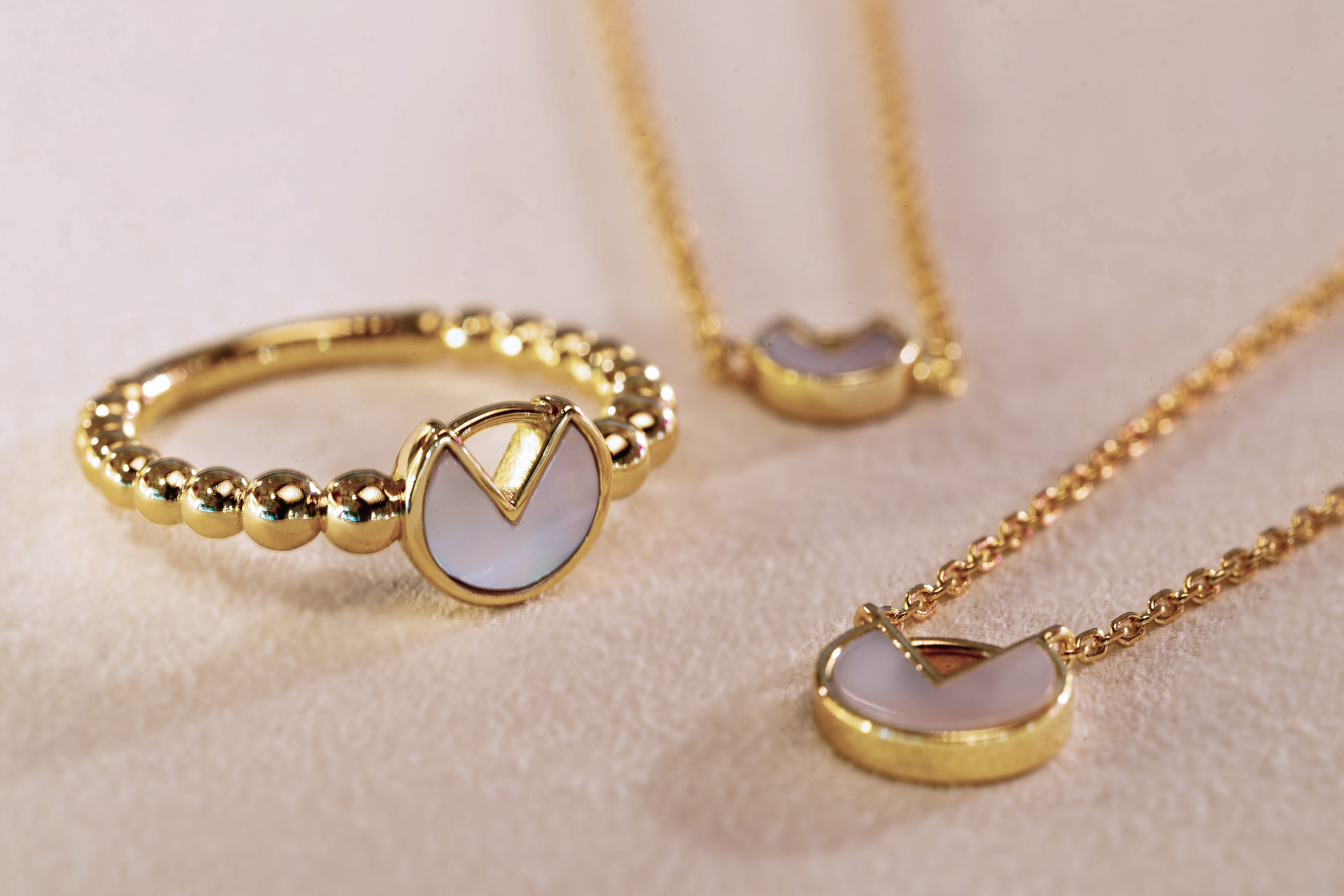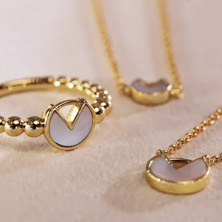 The entire series draws inspiration from the uniqueness of Fritillaria, showcasing its distinctive color and texture that convey a rich luster and depth. The design utilizes the color gradients and light-and-shadow effects of Fritillaria, while precise cutting and arrangement create circular shapes characteristic of the collection. The upward-inverted triangle design adds a unique geometric visual effect, enhancing the elegant natural beauty of each piece.