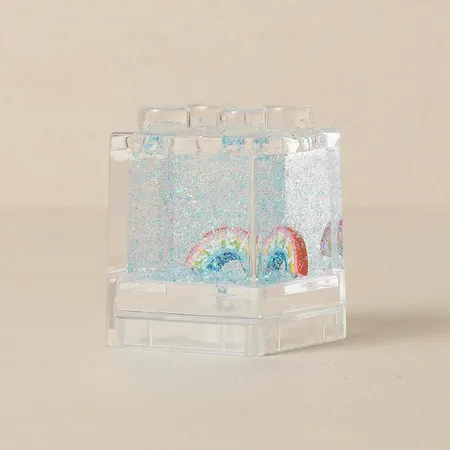 Petite glitter building block filled with water and shimmering glitter inside. By changing the figurine, it can become an everyday, seasonal or a promotional item.