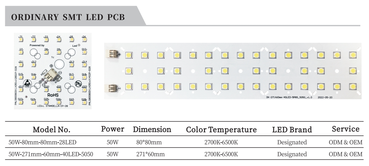 | 50W-271mm-60mm-40LED-5050 | 50W | 271*60mm | 2700K-6500K | Designated | ODM & OEM |