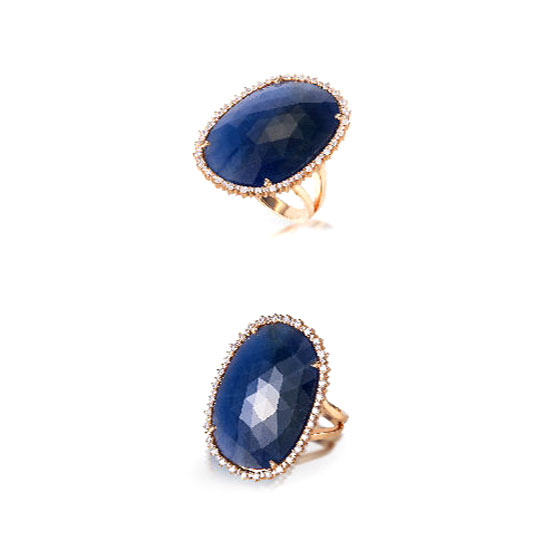 This is a fashionable ocean ring that comes with an elegant design. It is made with sparkling diamonds and an attractive sapphire as the centerpiece for a glamorous touch. Add charm to your look with this 18K pink gold diamond ring.