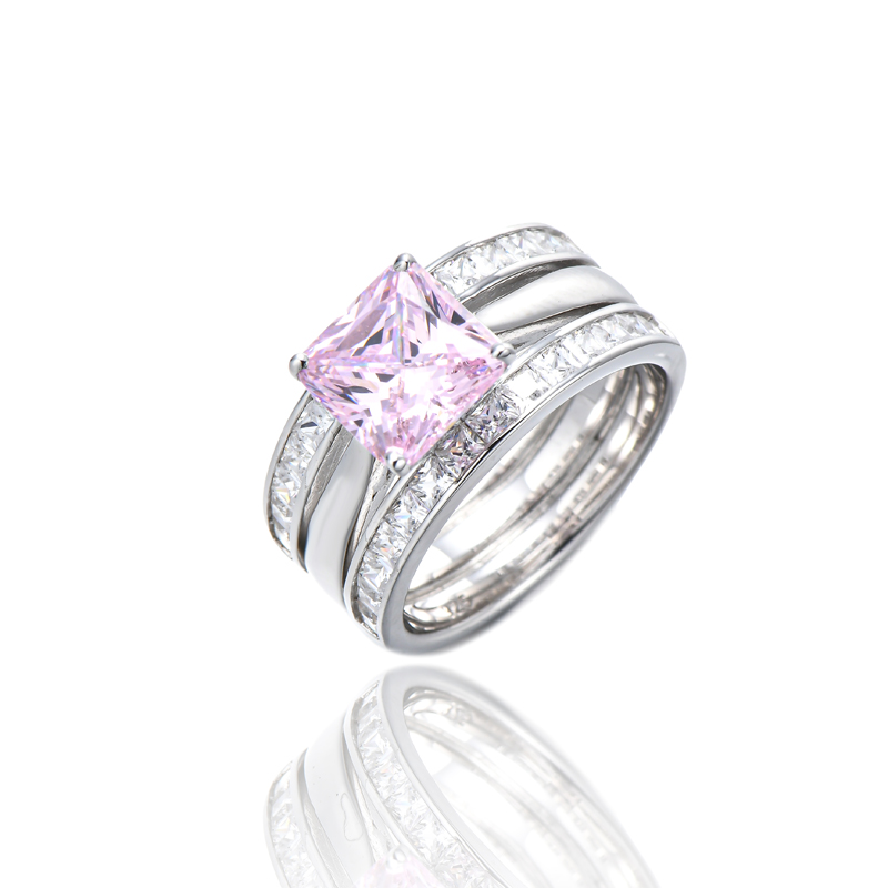Octagon Diamond Pink And Square White Cubic Zircon Rhodium Silver Ring