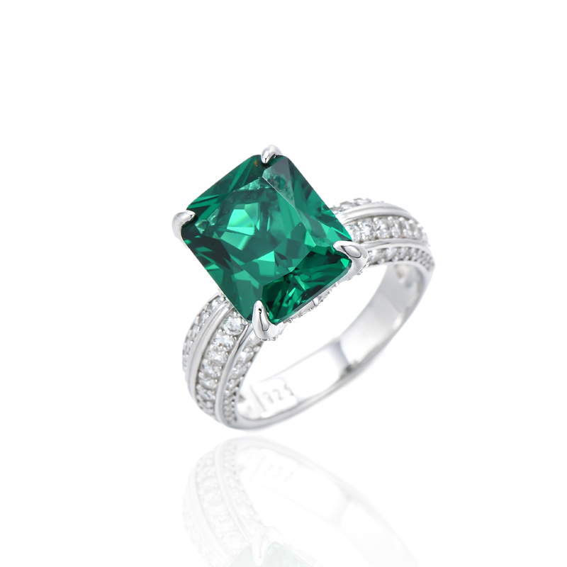 Octagon Green Nano And Round White Cubic Zircon Rhodium Silver Ring