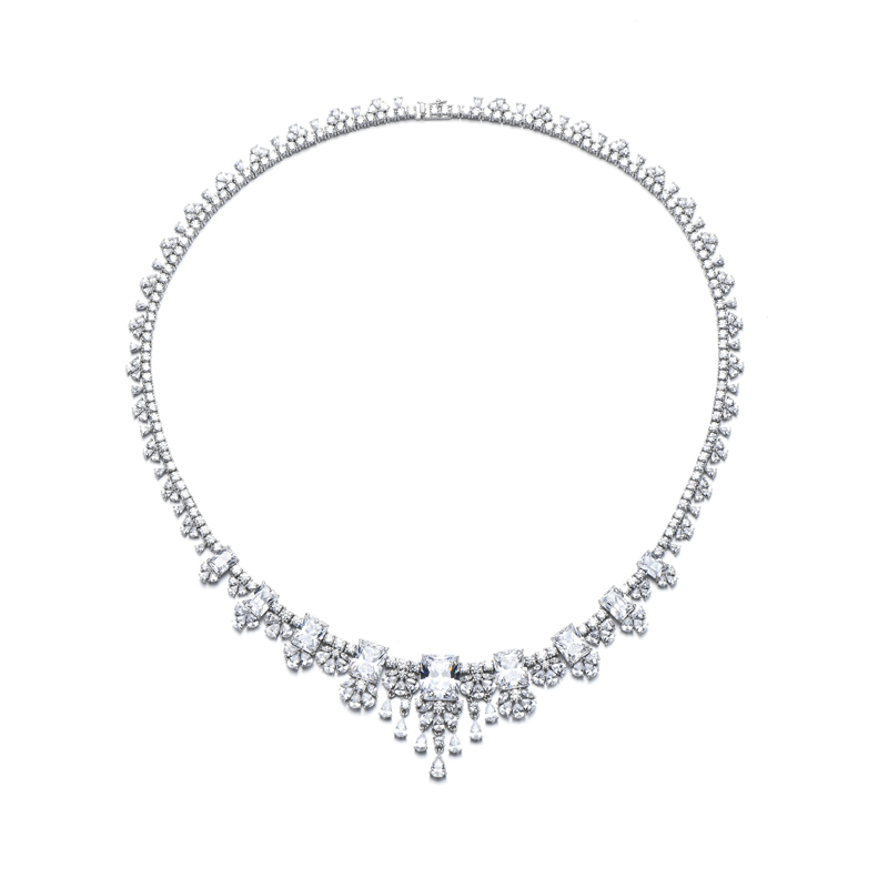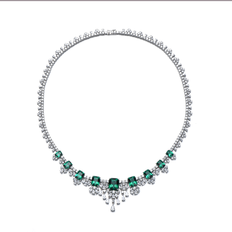 Octagon Green Nano And White Cubic Zircon Rhodium Silver Necklace