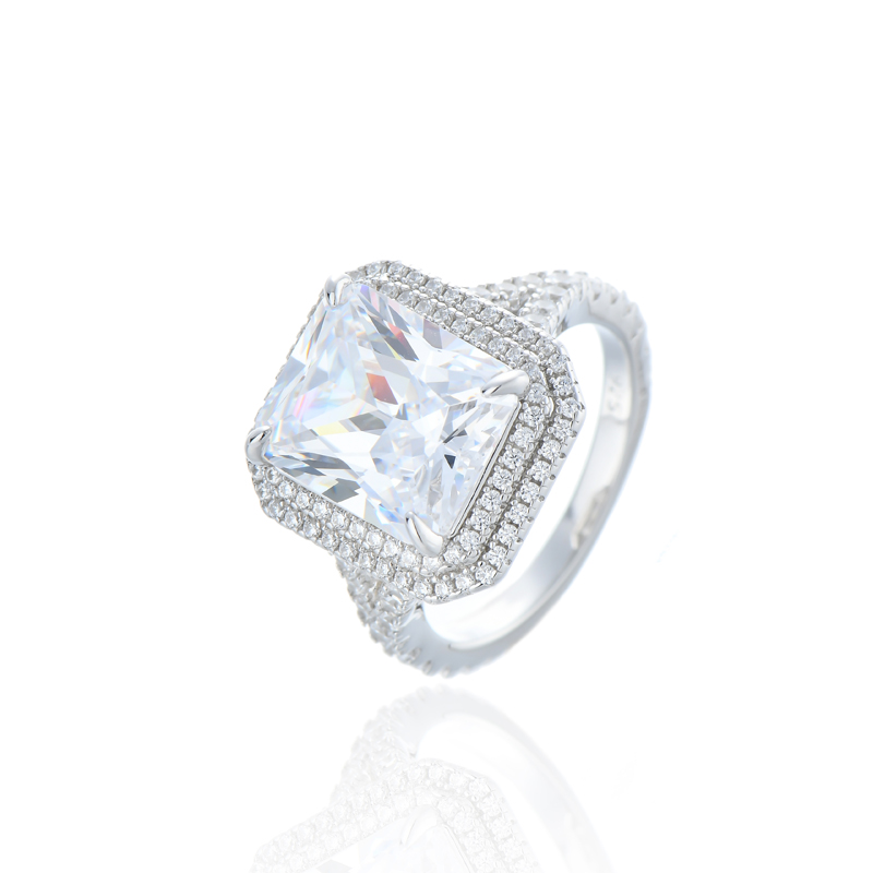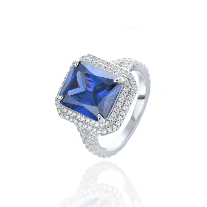 Octagon Tanzanite And Round White Cubic Zircon Rhodium Silver Ring