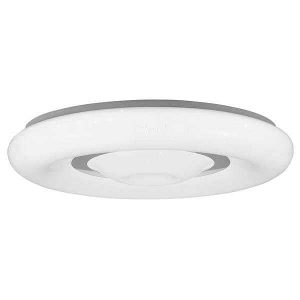 This is a round ceiling light. It has a layered design with a white outer ring and a central white part, along with some gray elements. The overall appearance is simple and elegant. When lit, it can emit soft light, suitable for creating a warm and comfortable atmosphere in indoor spaces such as living rooms and bedrooms.