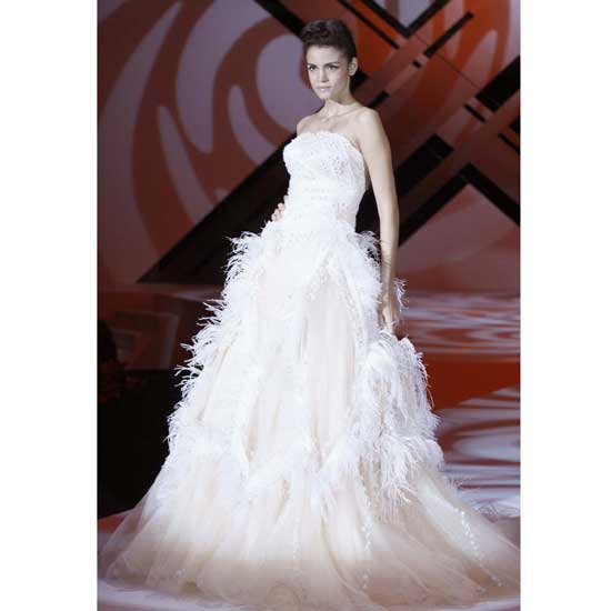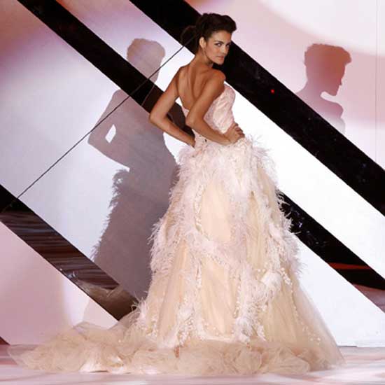 The bridal gown showcases a fitted bodice in an off-shoulder style. It features a flared bottom with feather decorations for added extravagance. Look gorgeous on your big day in this stunning piece of gown.