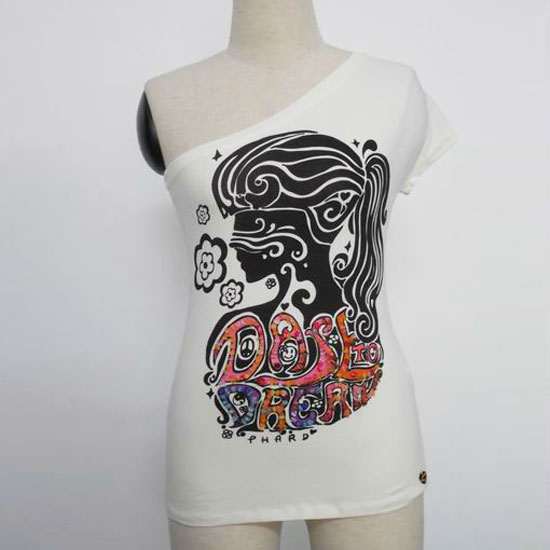 This fashionable T-shirt is made of combed cotton spandex fabric for a comfortable fit. It comes with an off-shoulder design and a skew collar for a unique touch. This off-shoulder T-shirt features abstract prints in multiple colors to catch your attention easily.