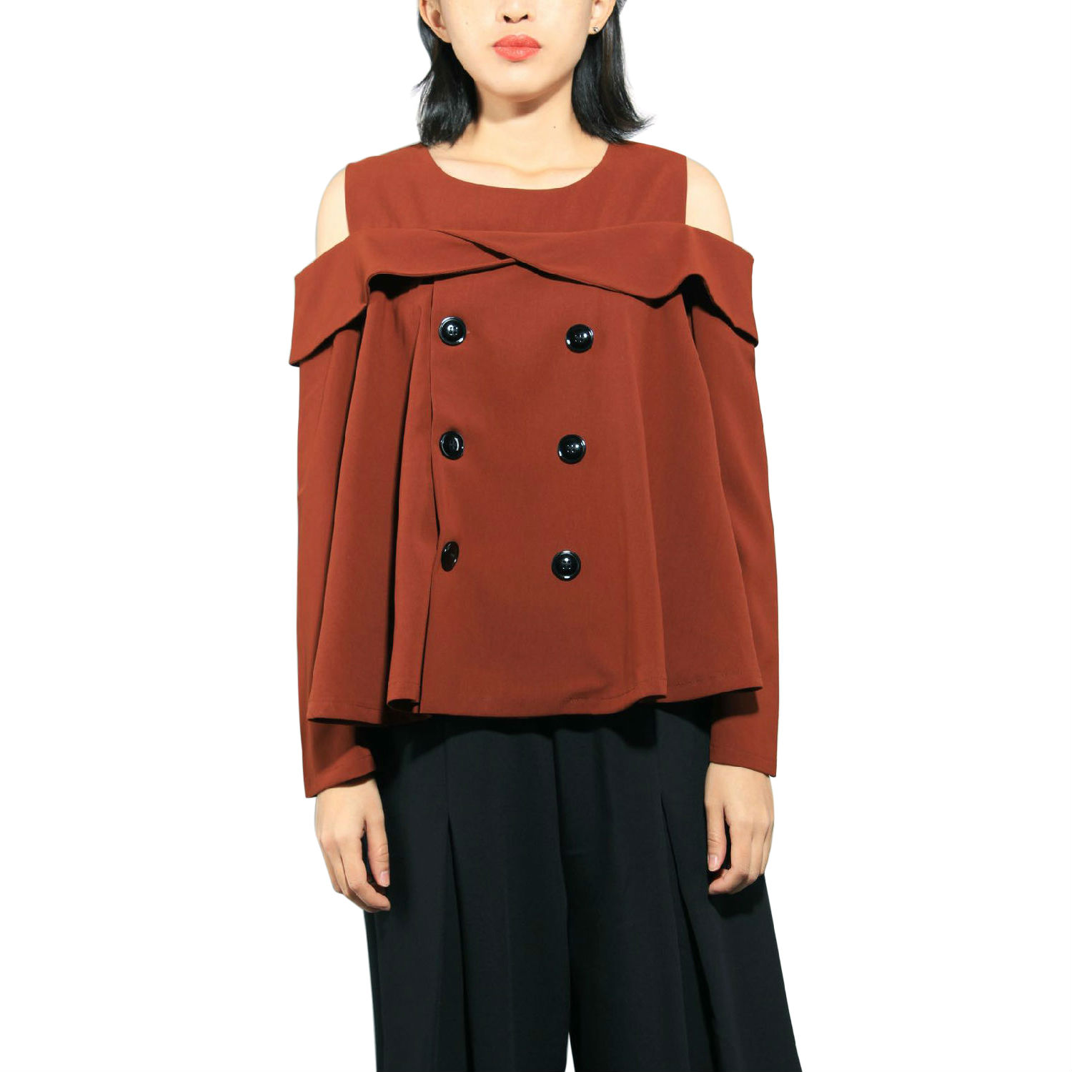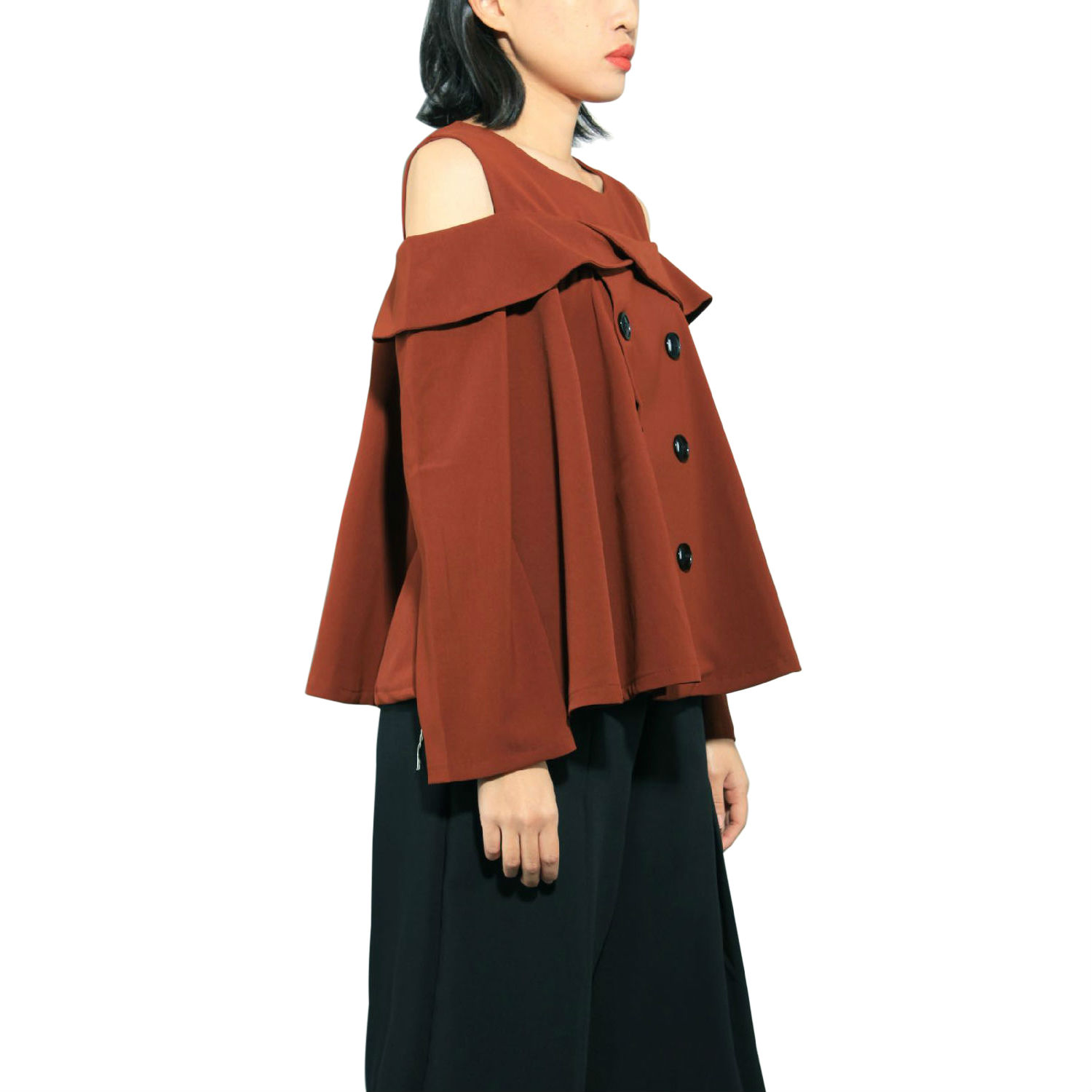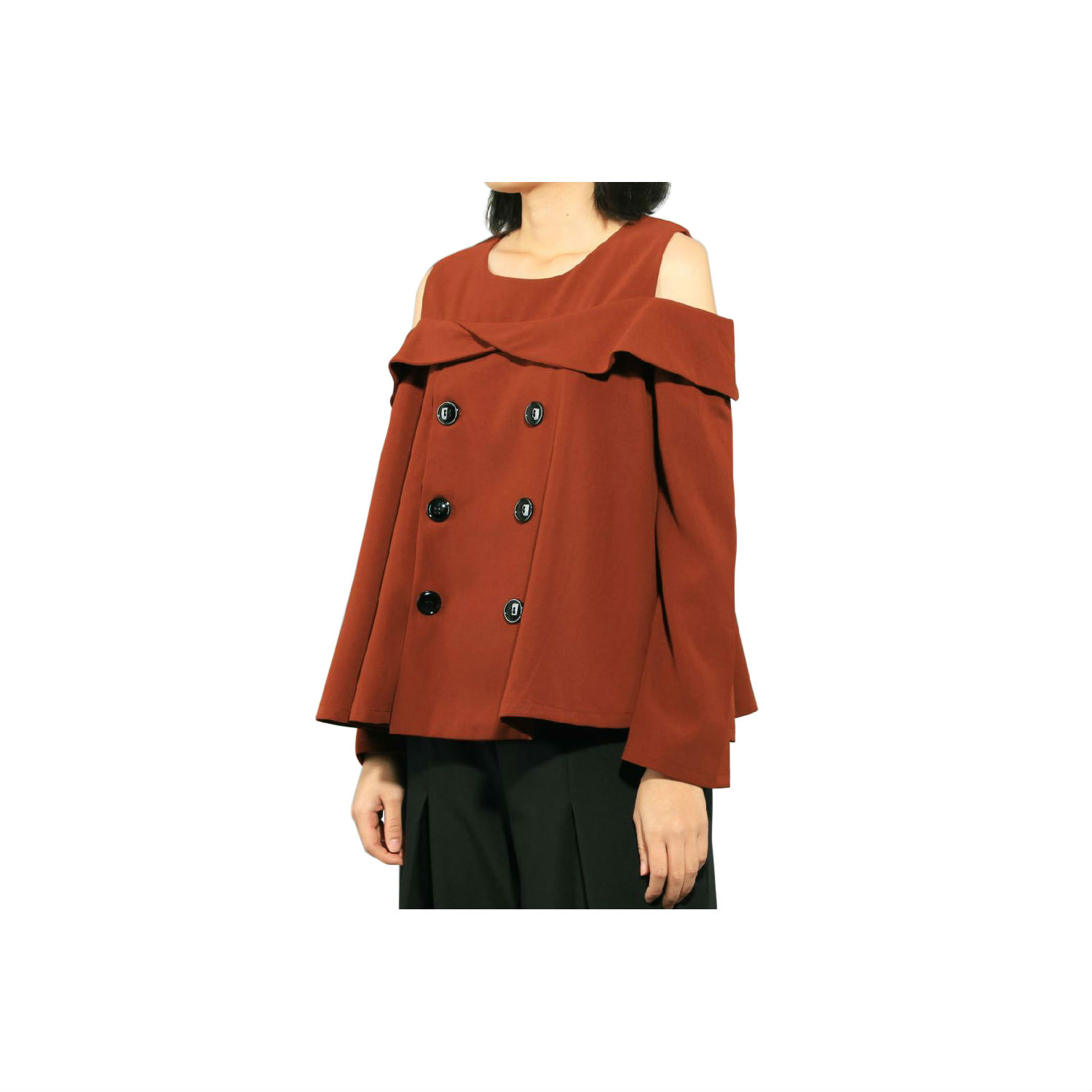 Bare your shoulders fearlessly in this fluid camel top. Cut in a loose silhouette, this curve-skimming top boasts casualness for versatile styling. The decorating buttons render a blouse-like design, with the overlay panel wrapped around the arms and chest for a flattering effect.