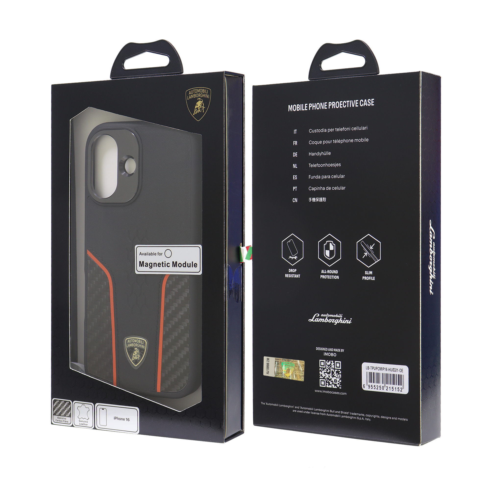 Official Licensed Lamborghini Huracan design genuine leather with carbon fiber phone case phone protective for iPhone 16 with MagSafe compatible