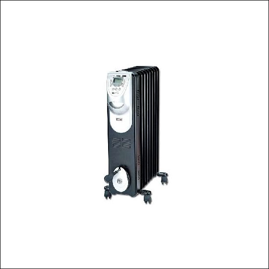 Displayed here is an oil filled heater. Using electricity as its source, the heater is efficient in maintaining room temperature, and is safer to use when compared with a gas heater, which may lead to gas emissions. With a digital control system and a 24-hour timer, the machine features easy operation. It also comes with four wheels so that it can be moved to wherever it is needed. This heater is an ideal household appliance for maintaining room temperature.