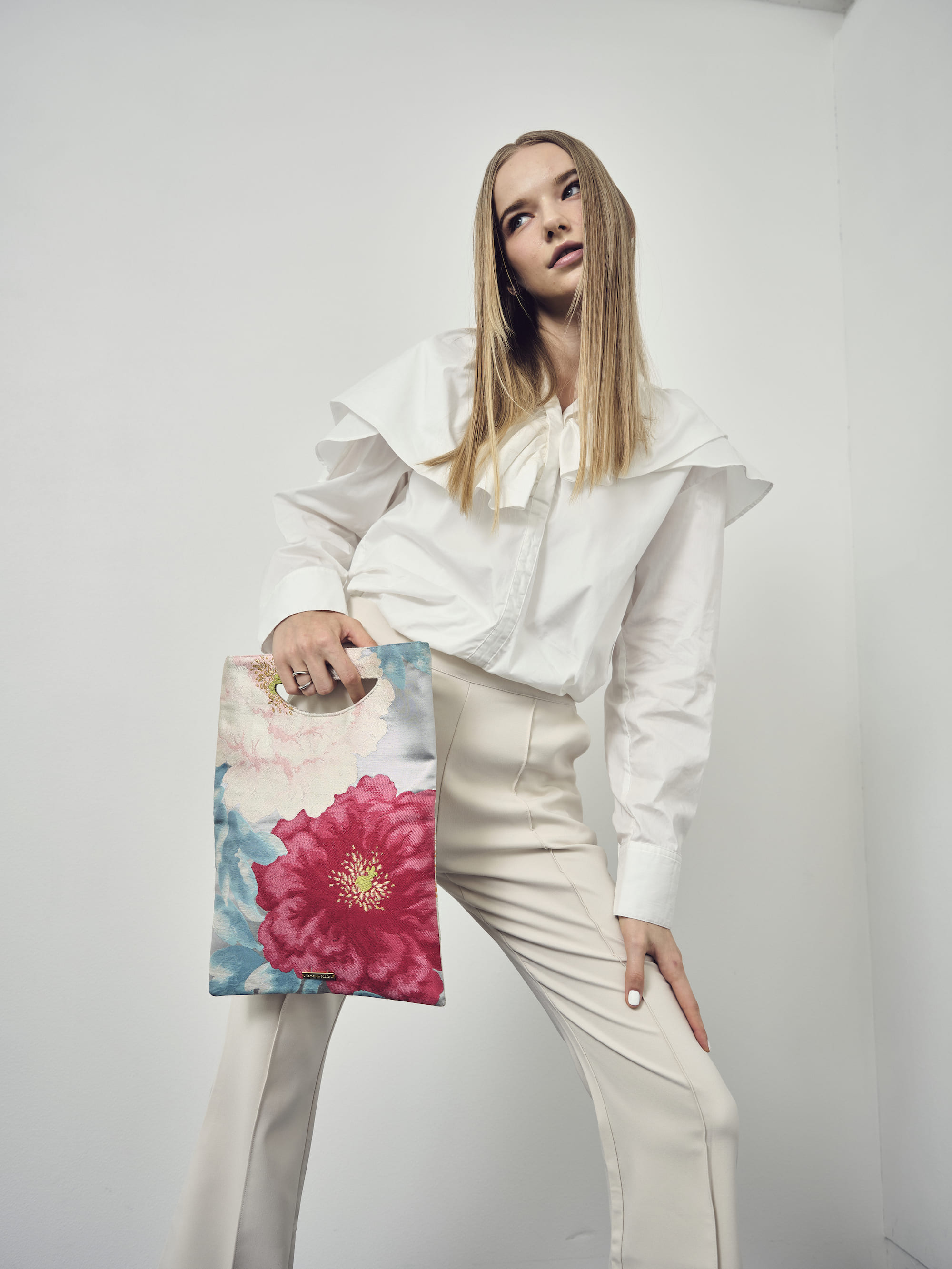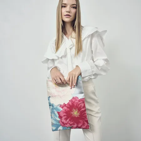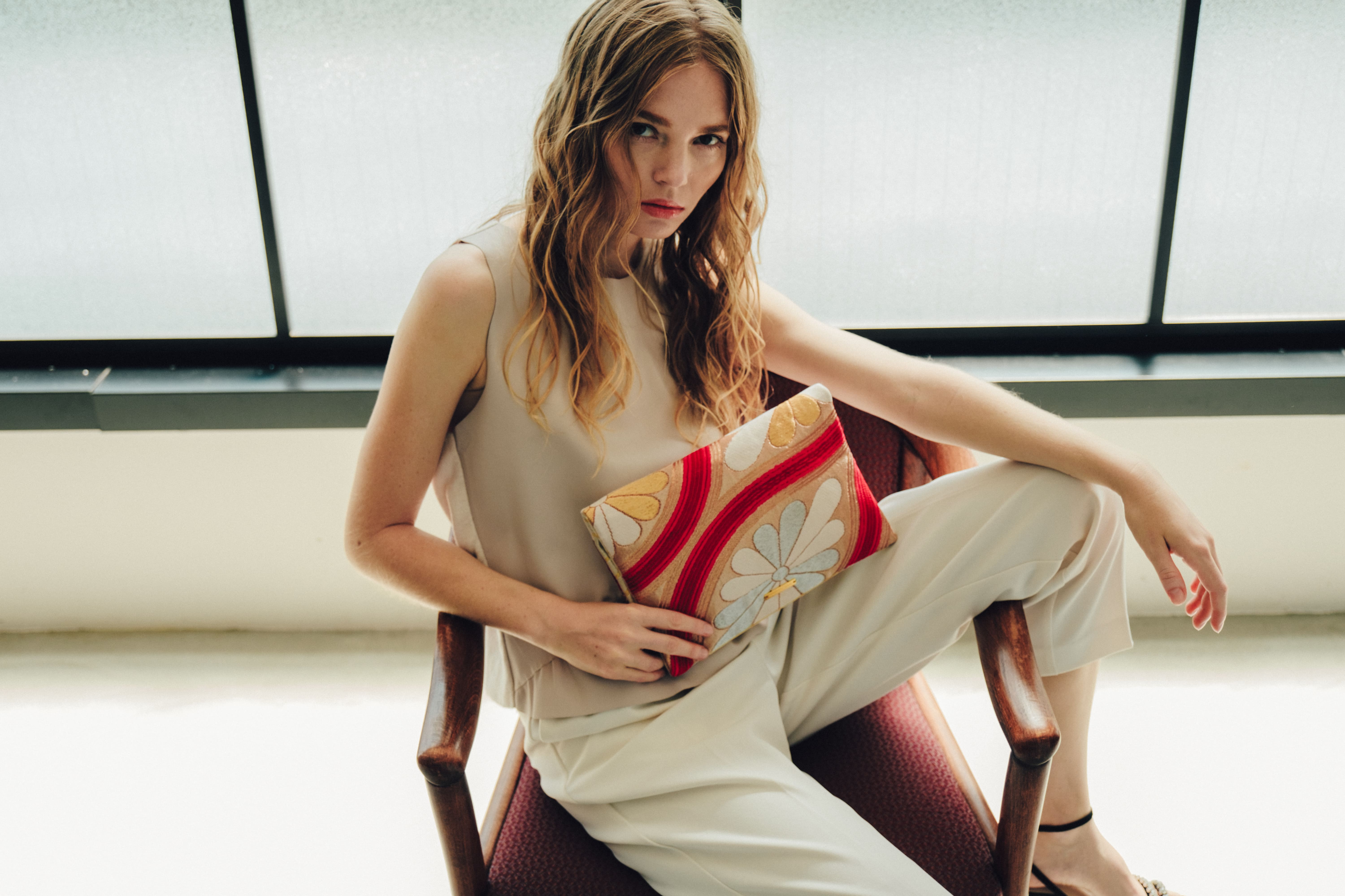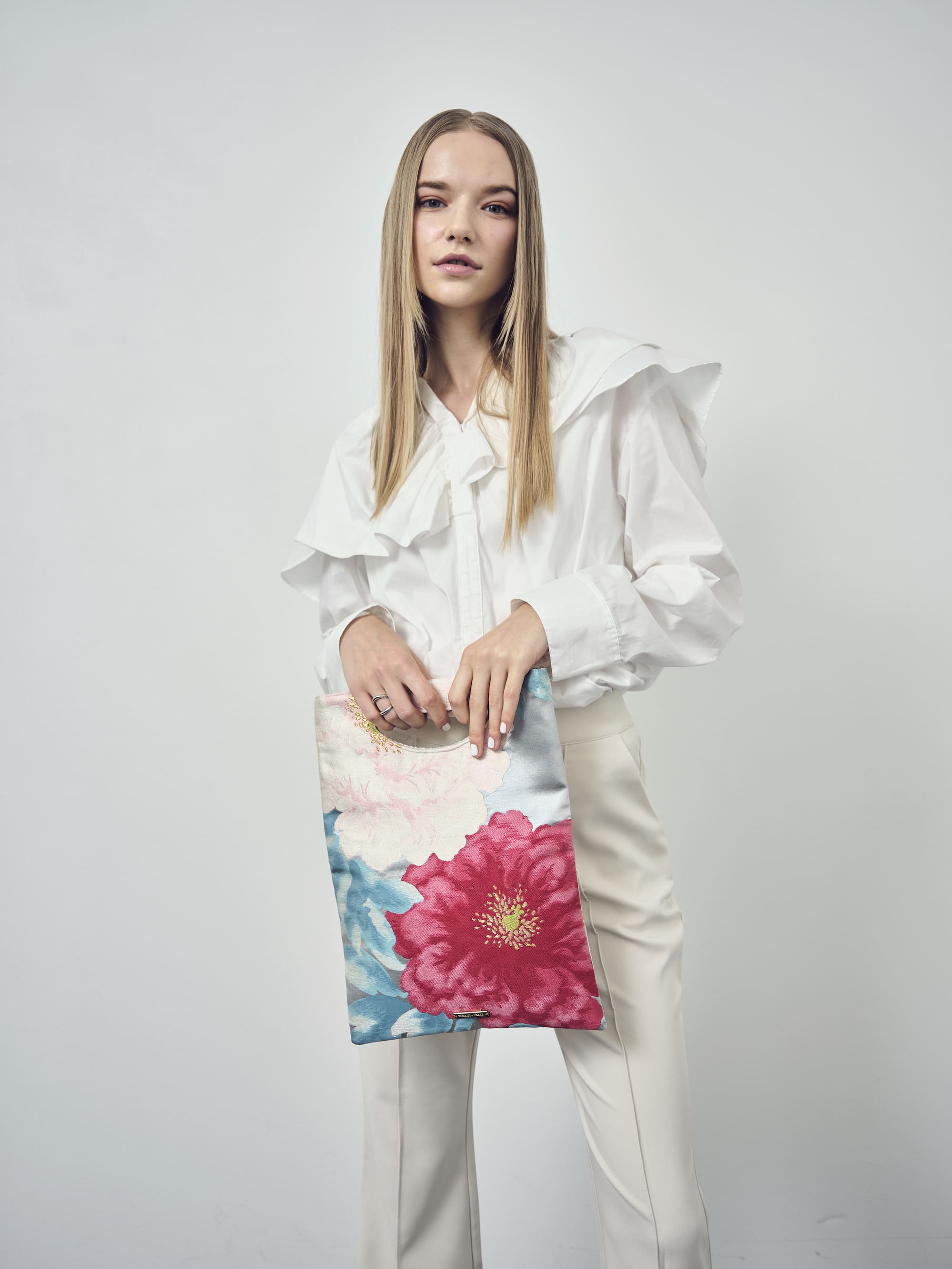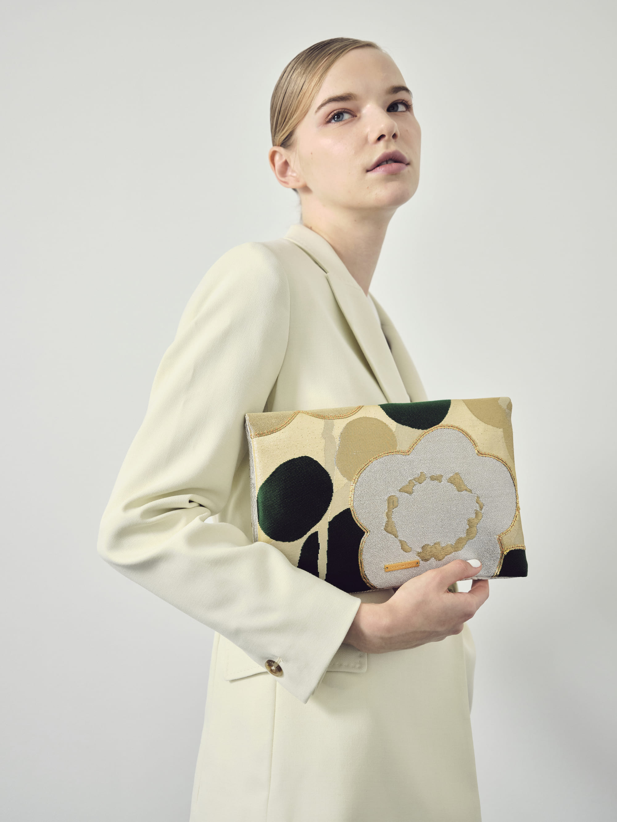 A one-of-a-kind 2-way bag crafted from vintage kimono and obi, usable as both a clutch and a tote.
