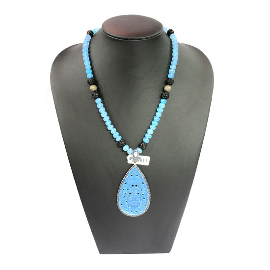 This exotic necklace is contracted of a drop-shaped blue onyx pendant and a beaded onyx chain. The pendant is encircled by twinkling white diamonds set in silver. The timeless onyx necklace makes a great addition to any jewelry collection.