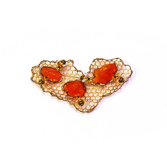 This brooch features a heart-shaped, diamond-embellished honeycomb, on which three drops of honey made of opal and five gold honey bees are set. This brooch is delicate and adorable. The honey bee brooch beautifully decorates plain tops like suit jackets and blouses.